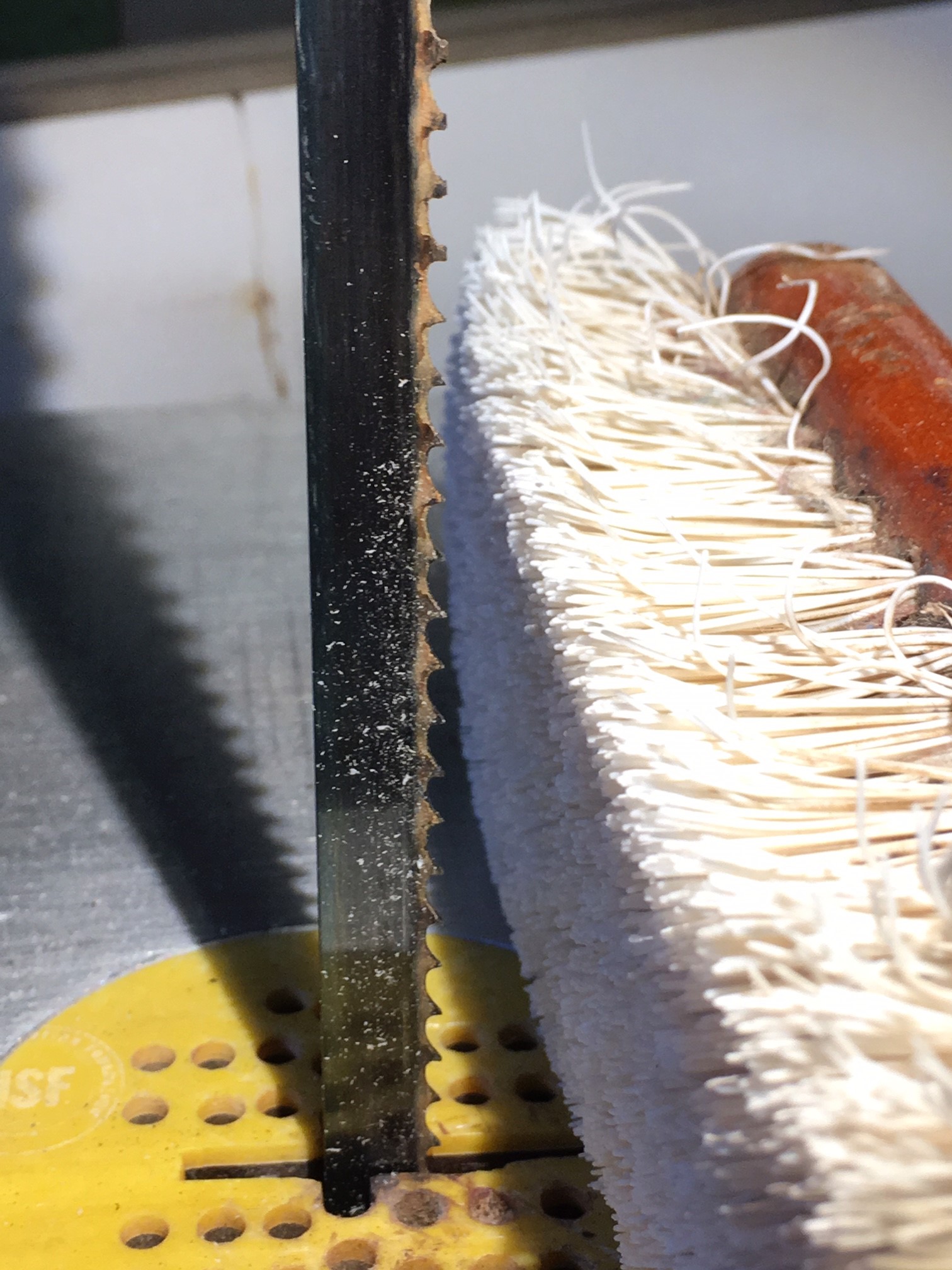 Επίσης, αυτό που μου έχει διδάξει η εμπειρία μου είναι ότι η οδόντωση πρέπει να παραμένει καθαρή από υπολείμματα που αφήνουν τα λιπαρά ξύλα (παλίσσανδρος, έβενος, κοκομπόλο κλπ). Ο τακτικός καθαρισμός με σκληρή βούρτσα (φωτο παρακάτω) βοηθάει στη μακροζωία της λάμας και στην ποιότητα του κοψίματος .