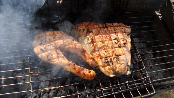 Παρεμπιπτόντως δεν είναι κοψίδια, σολωμός είναι. Οι δυο μεγάλοι φάγαμε το αριστερό κομμάτι κι ο μικρός το δεξί. Απορώ που τα βάζει.