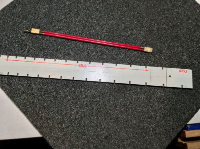 Ανακάλυψα όμως ότι ένα καλούπι που ήδη έχω για τη χάραξη τάστων μπουζουκιού με κλίμακα 673,1 χιλιοστά (26,5 ίντσες) έρχεται πολύ κοντά αν παραλειφθεί το πρώτο τάστο. Η κλίμακα του οργάνου λοιπόν θα είναι τελικά 635 χιλιοστά, δηλαδή 2,6 χιλιοστά περισσότερο από ό,τι προβλέπει το σχέδιο.