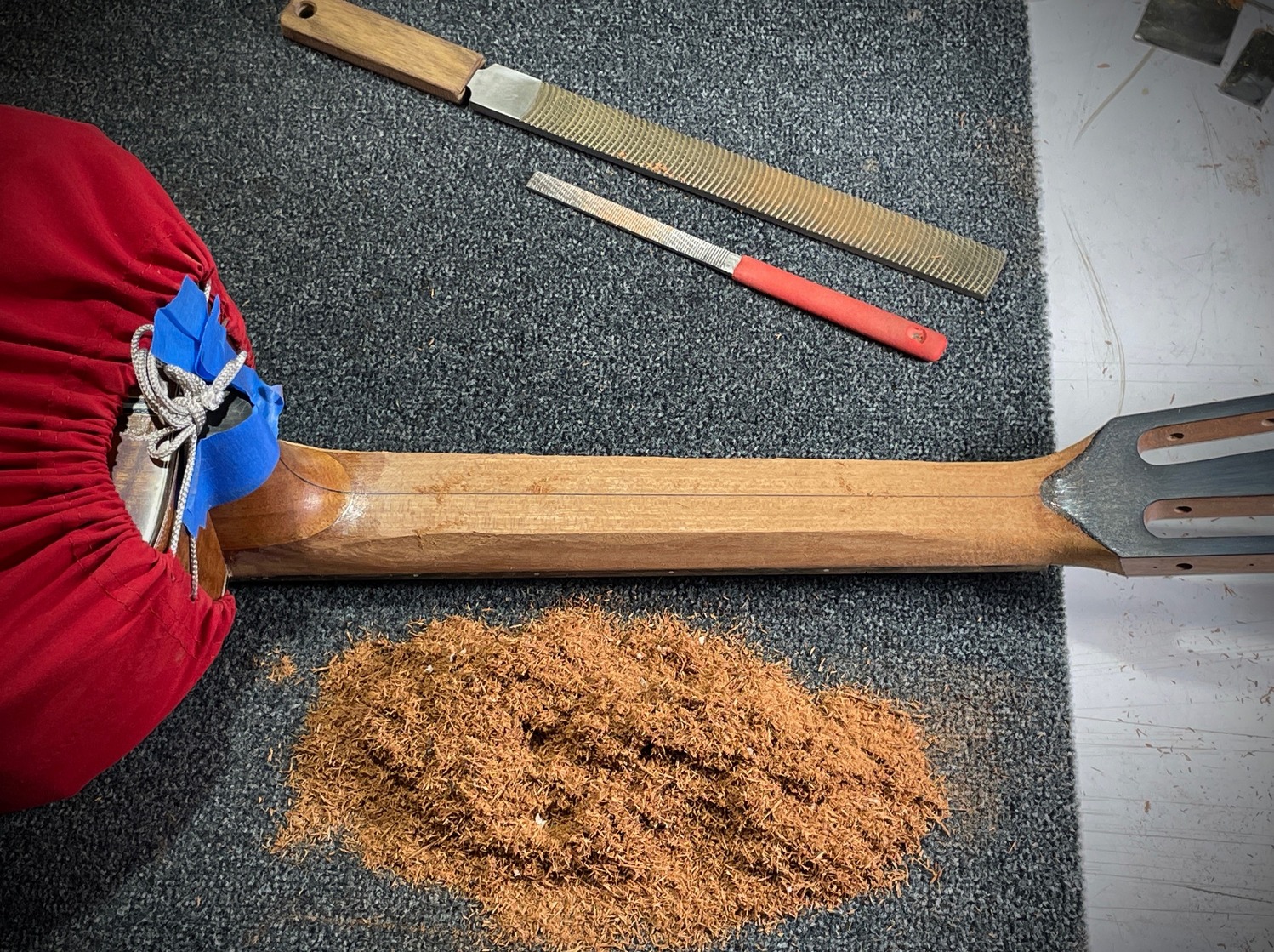 Πριν από το κάρφωμα των τάστων ο έβενος τρίβεται και γυαλίζεται μέχρι Ρ2500.