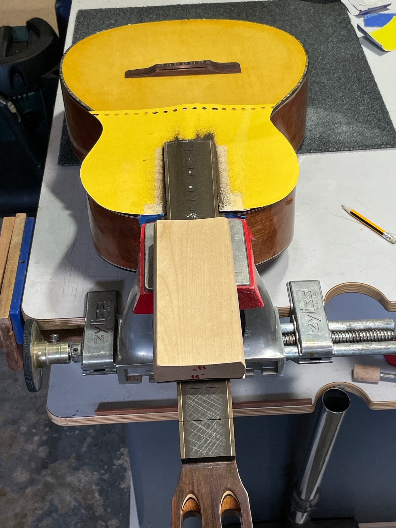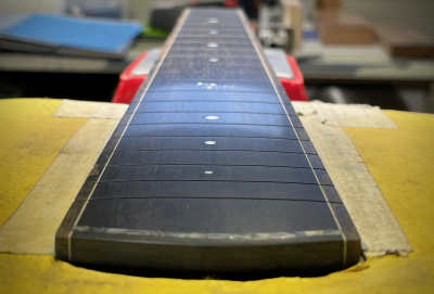 Στη φωτογραφία διακρίνεται και η τρυπούλα από την καρφίδα που διασφαλίζει το κλείδωμα της θέσης της ταστιέρας καθώς η ίδια τρύπα συνεχίζει και στο μαόνι από κάτω. Θα καλυφθεί όταν μπει το τάστο.
