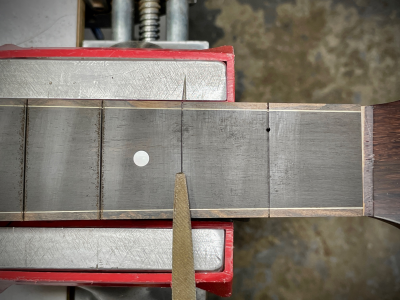 Πριν από το κάρφωμα των τάστων συνηθίζω να ανοίγω ελαφρά το χείλος των σχισμών με τριγωνική λίμα. Διευκολύνει πολύ στο να βρίσκει το τάστο τη θέση του.