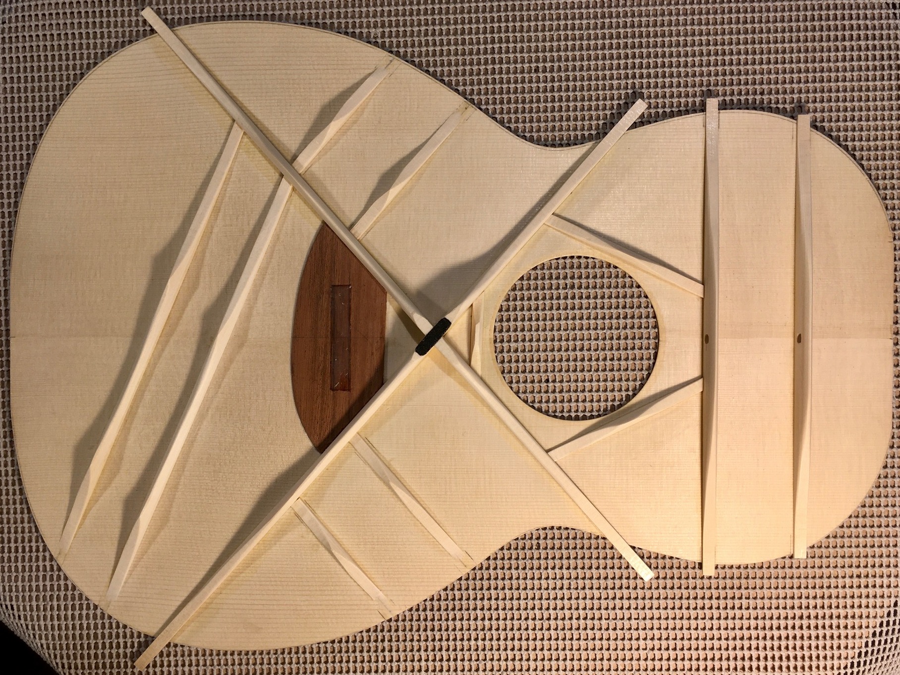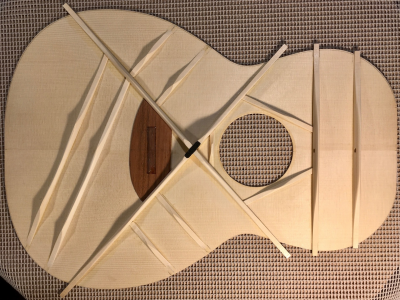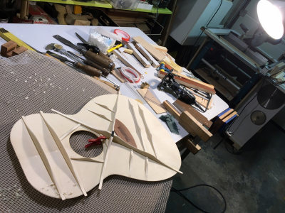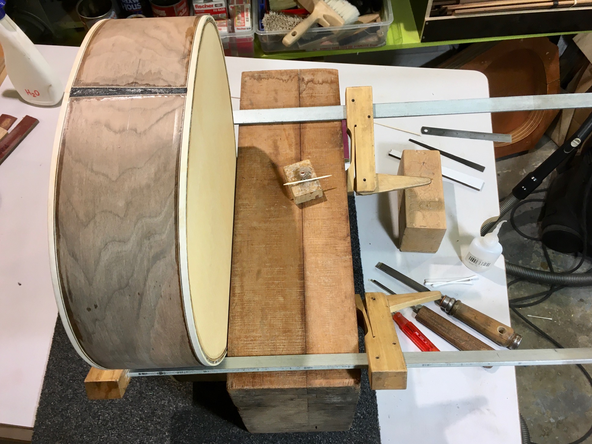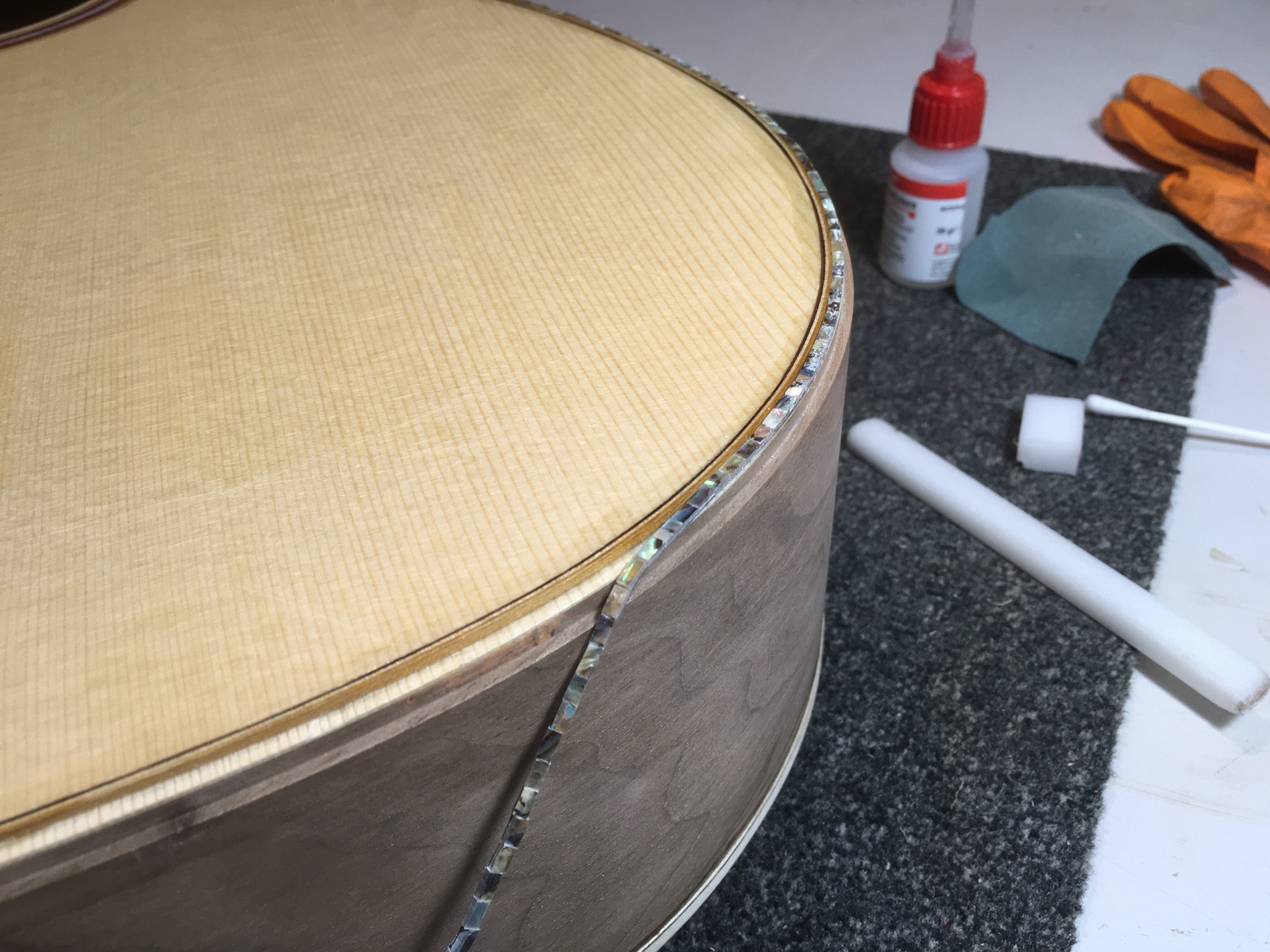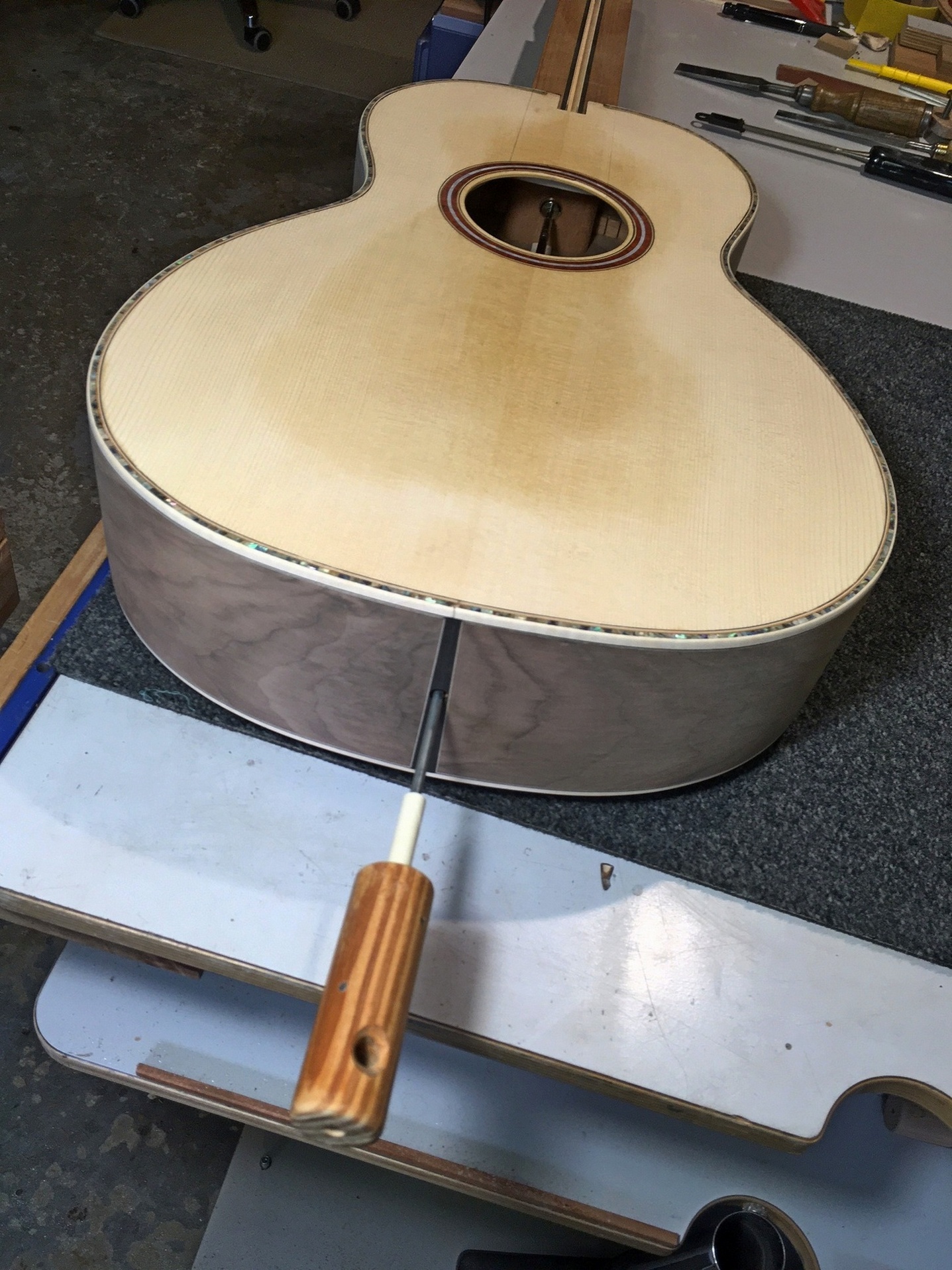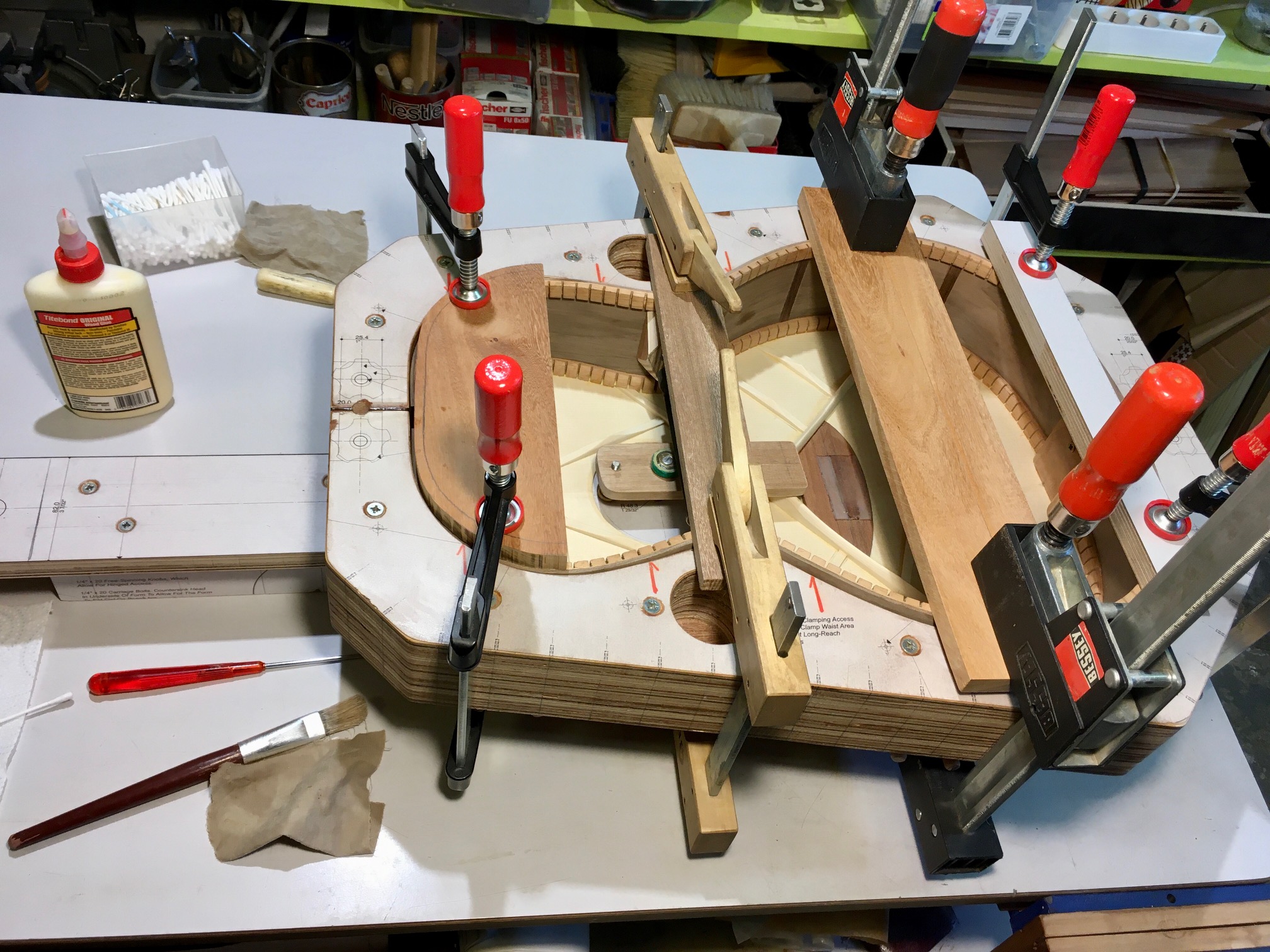Η πλάτη κολλήθηκε χρησιμοποιώντας ελαστικό κορδόνι (bangee) 6 χιλιοστών. Πολύ βολικό. Η ιδέα είναι του Greg Nelson https://www.youtube.com/watch?v=2a0Z5DaWfJE&ab_channel=NelsonsGuitars (στο 11:35).