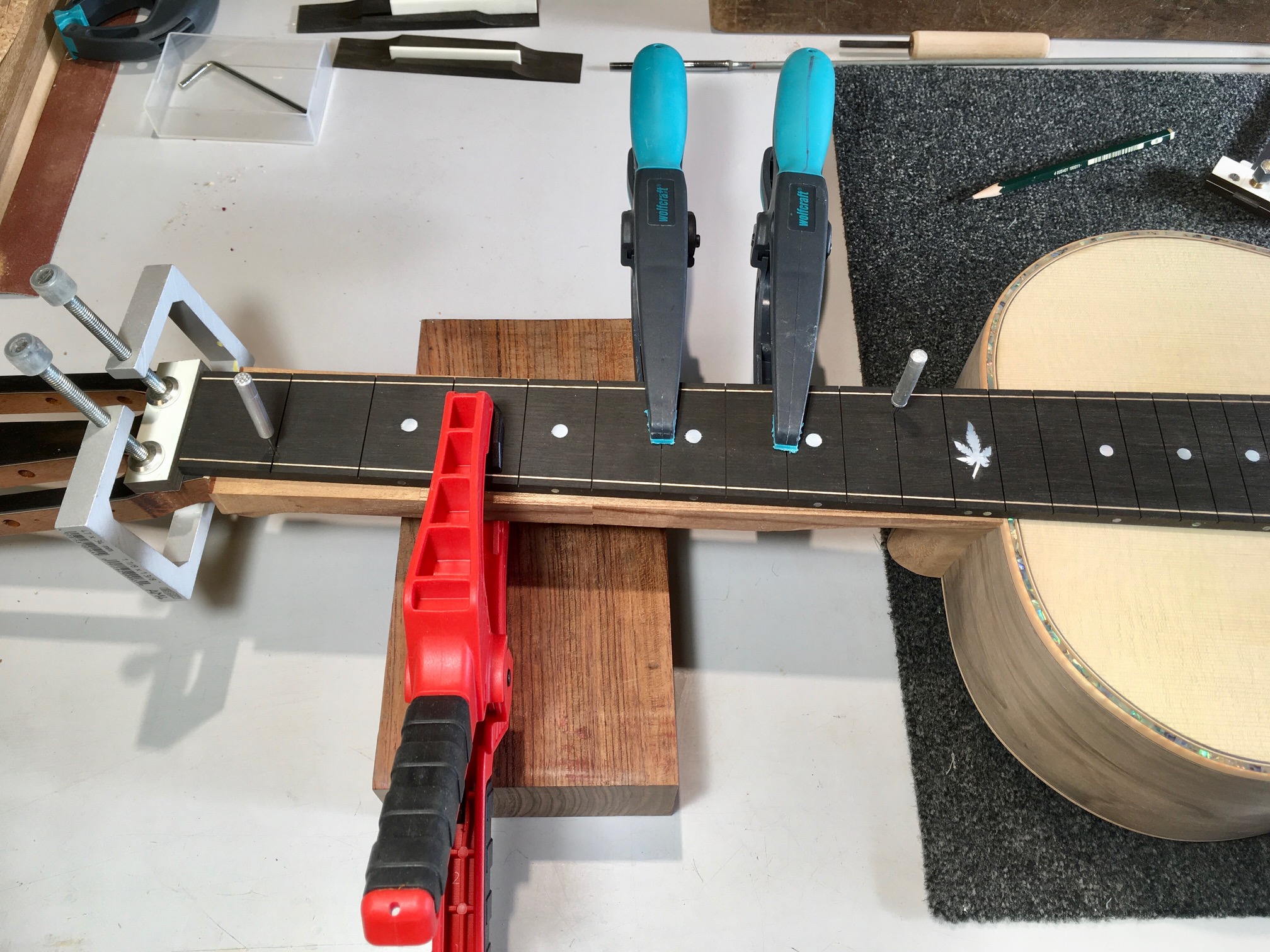 Για να «κλειδωθεί» η ταστιέρα στη θέση της χρησιμοποιήθηκαν δυο καρφίδες με διάμετρο 1,5 χιλιοστό. Τρυπήθηκε η ταστιέρα (μαζί με λίγο μαόνι από το μάνικο) ακριβώς στο αυλάκι του 1ου και του 10ου τάστου. Όχι στο διαμήκη άξονα γιατί από κάτω περνάει το truss rod.