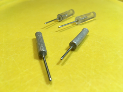 Για τις καρφίδες προθυμοποιήθηκαν δυο παλιά τρυπανάκια που είχανε βγει στη σύνταξη. Στρογγυλεύτηκε η απόληξή τους και φυτεύτηκε (η μεριά που τρυπάει!) με εποξική κόλλα σε βέργα αλουμινίου. Σε δεύτερο πλάνο φαίνεται μια πρώτη απόπειρα με βελόνα πλεξίματος (από μαλακό μέταλλο) που τελικά δεν έπεισε.