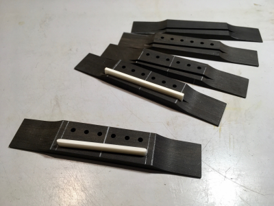 Όσο για τον προσδιορισμό της θέσης της γέφυρας-καβαλάρη βρήκα ότι η μελαμίνη υψηλής συμπίεσης (HPL) αποδείχτηκε για άλλη μια φορά ένα βολικό και αξιόπιστο υλικό για την κατασκευή του σχετικού βοηθήματος (λειτουργεί περίπου όπως αυτό https://www.stewmac.com/luthier-tools-and-supplies/tools-by-job/tools-for-measuring/saddlematic.html)