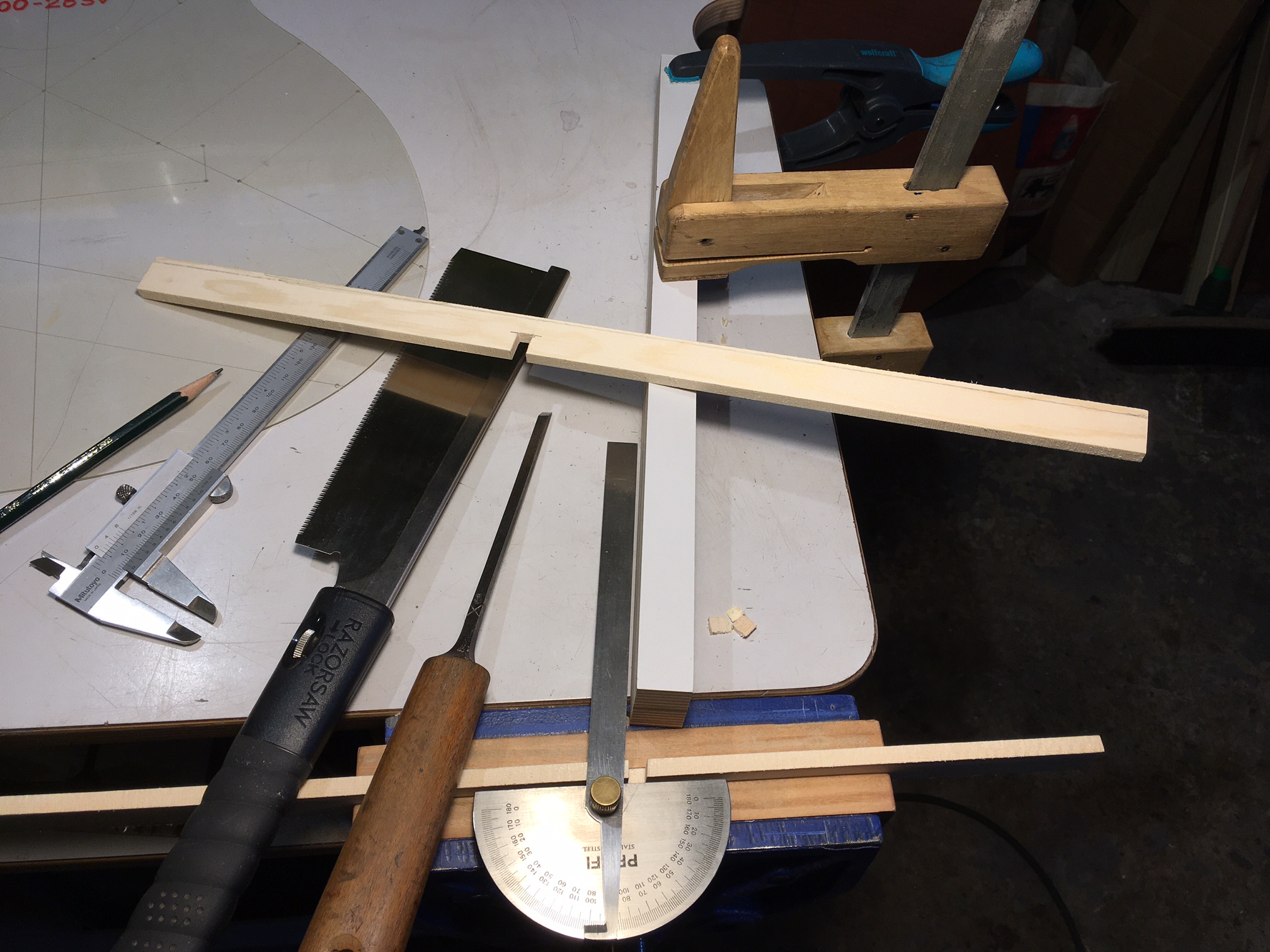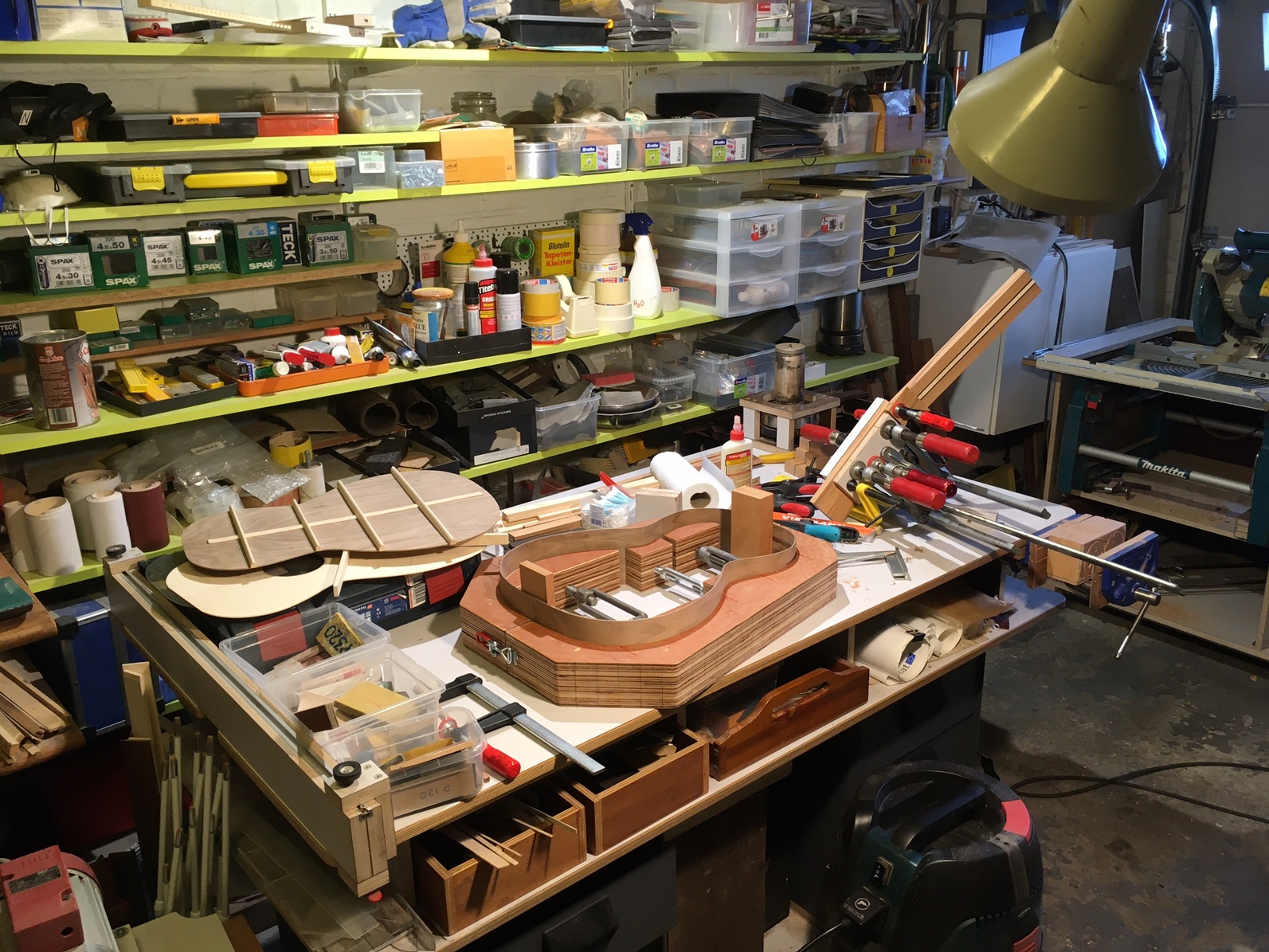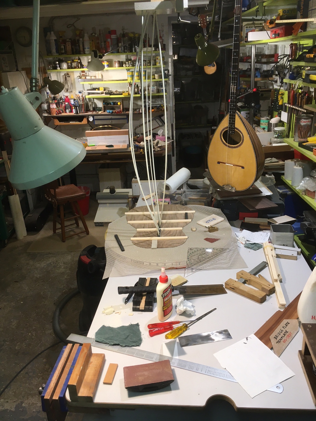 Η πλάτη ξαπλώνει σε καινούργιο radius dish με πολύ κλειστή καμπυλότητα, ακτίνας 3,6 μέτρων (12 ft). Υπηρεσίες go-bar πρόσφερε ένα κομμάτι χαμηλής οροφής του εργαστηρίου. Οι πρώτες βέργες που χρησιμοποίησα για τη συγκόληση ήταν από φάιμπεργκλας. Το κρεμασμένο μπουζούκι παρακολουθεί με ενδιαφέρον!