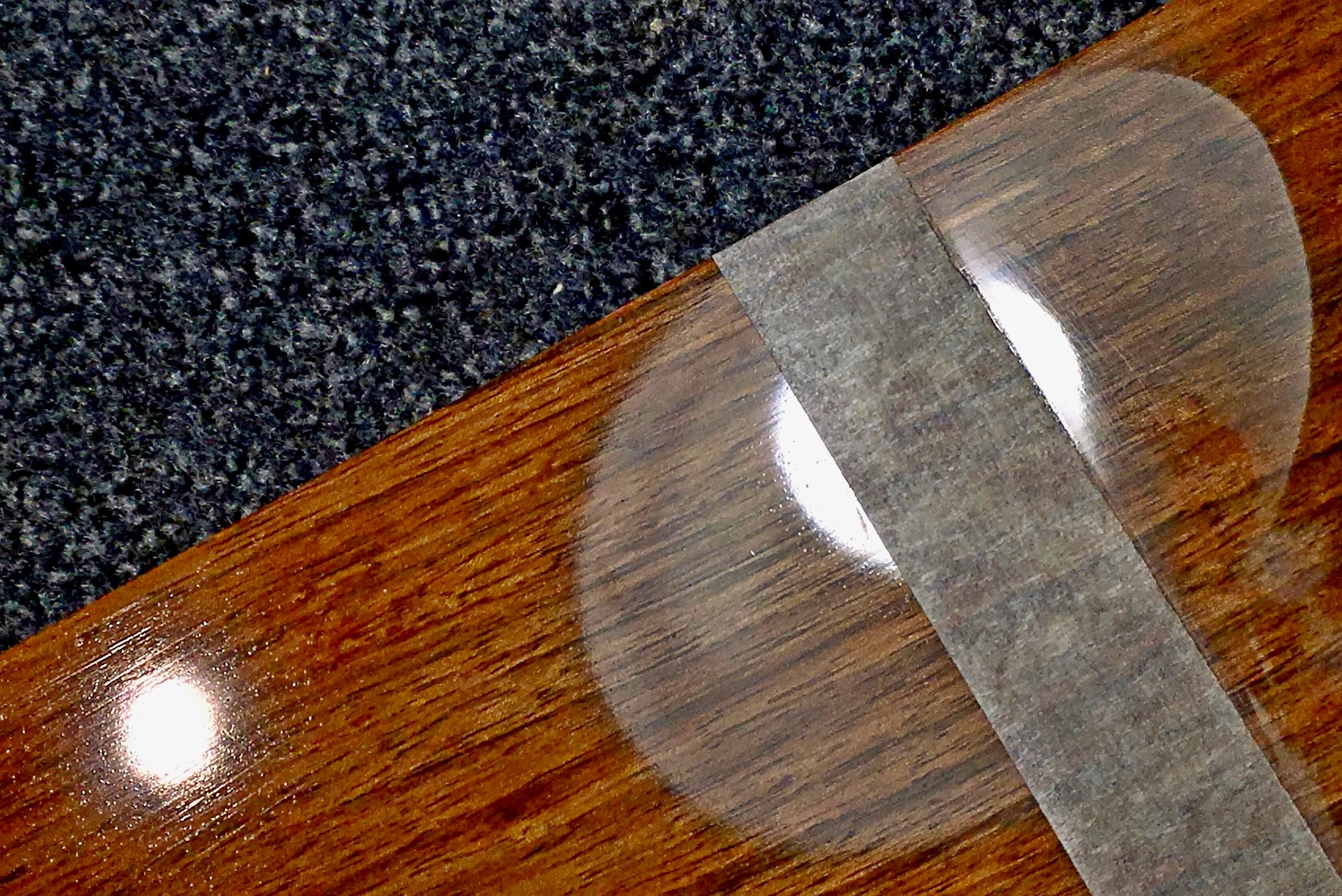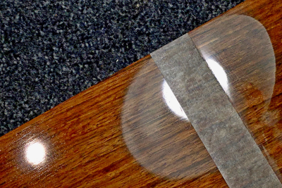 Στα αριστερά της φωτογραφίας είναι το βερνίκι όπως στέγνωσε αφού περάστηκε με πινέλο ζωγραφικής. Στα δεξιά, μετά από τη λωρίδα χαρτοταινίας, φαίνεται όπως γίνεται με τα τριψίματα με Ρ1000, Ρ2000, Ρ3000, Ρ6000, φίνα σμυριδαλοιφή (very fine compound) και τέλος επάλειψη και εντριβή με προστατευτικό κερί αυτοκινήτων με ρητίνη καρνάουμπα. Η διαφορά πριν-μετά διακρίνεται καλά στο αυγοειδές περίγραμμα του φωτιστικού που καθρεφτίζεται.