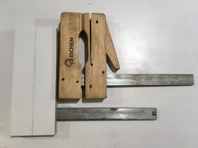 Πράγματι Ιωσήφ, την τσάκωσες τη λεπτομέρεια! Είχα δυό τέτοιους σφικτήρες εμπορίου με ράβδο μήκους 60 εκατοστών και λαιμό 11 εκατοστά. Έκοψα τις ράβδους σε δυο κομμάτια 30 εκατοστών και έφτιαξα άλλους δυο σφικτήρες με μακρύτερο λαιμό 14 εκατοστά, αντιγράφοντας λίγο-πολύ τους υπάρχοντες. (Αλλά υπάρχει πληθώρα από βίντεο για το πώς γίνονται https://www.youtube.com/results?search_query=wooden+cam+clamps)