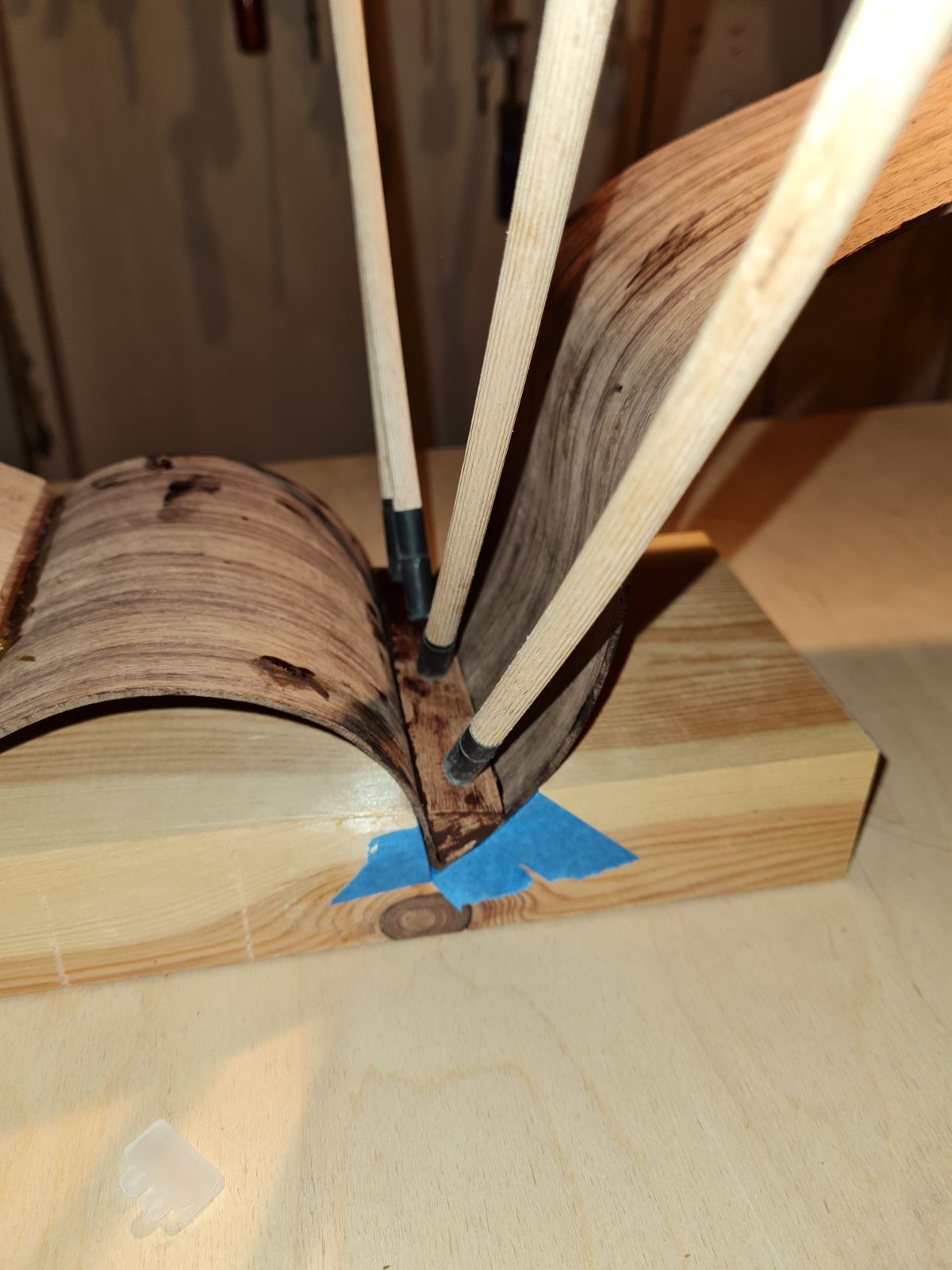 Αφου λυγίστηκε και το cutaway κομμάτι και κολήθηκε στον τάκο ήρθε η ώρα να κολληθούν μεταξύ τους τα δύο κομμάτια του πλαινού με την βοήθεια του πάγκου go bar και ενος κατάλληλα διαμορφωμένου ξύλου για να υποδεχτεί τα δύο κομμάτια μαζϊ με την εσωτέρικη ενίσχυση από μαόνι..