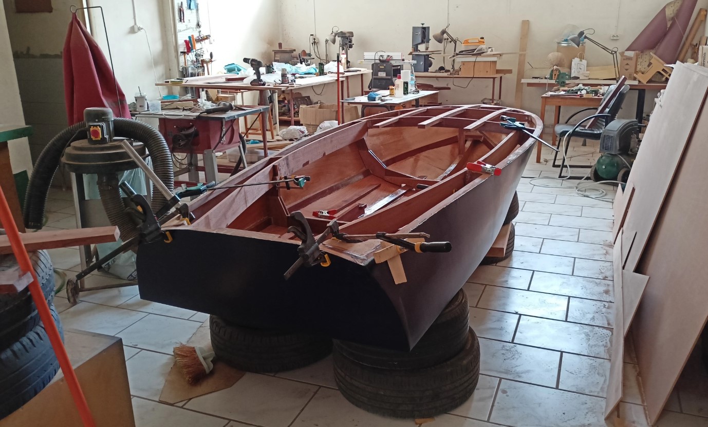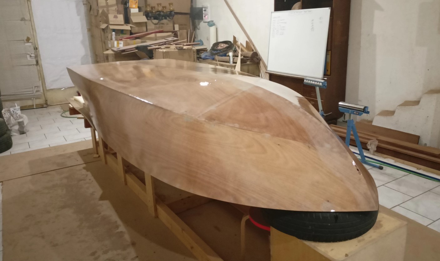 Το σκάφος ξανατούμπαρε. Τοποθετήθηκε προσωρινά πάνω σε λάστιχα αυτοκινήτου, γιατί για να ξαναμπεί στη βάση πρέπει να διαμορφωθεί αυτή καθώς πλέον υπάρχει η καρίνα. Θα την φτιάξω καποια στιγμή και μόλις βρω παρέα θα την μεταφέρω. Και στις ρόδες πάντως μπορούν να γίνουν άνετα εργασίες. Είναι λίγο πιο χαμηλά (έχω βάλει δύο ρόδες για να σηκώθεί λίγο παραπάνω) αλλα οι εργασίες γίνονται σχετικά άνετα.