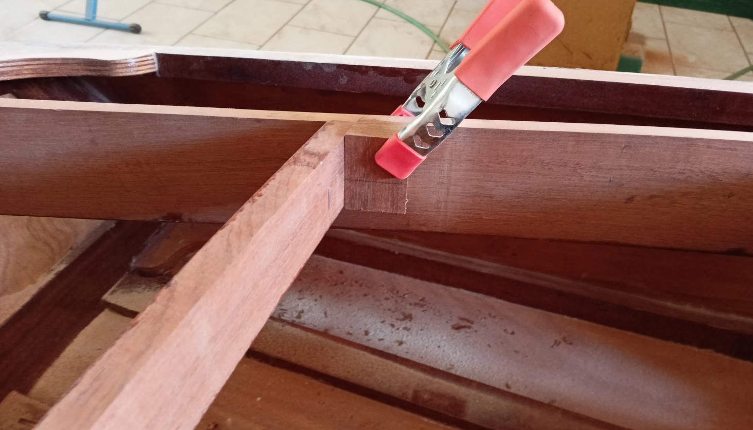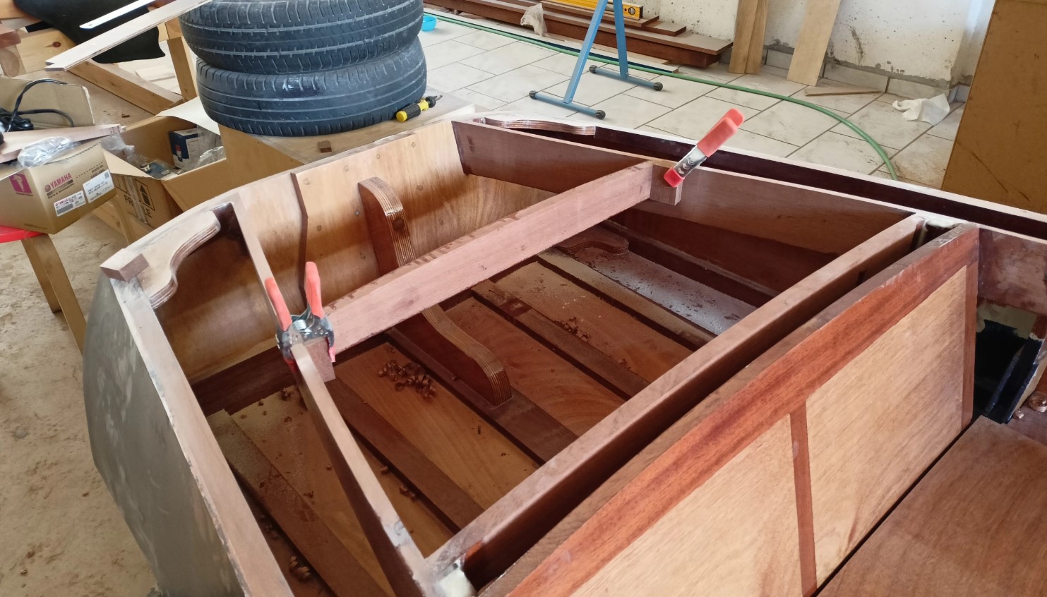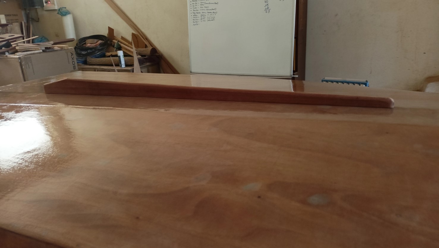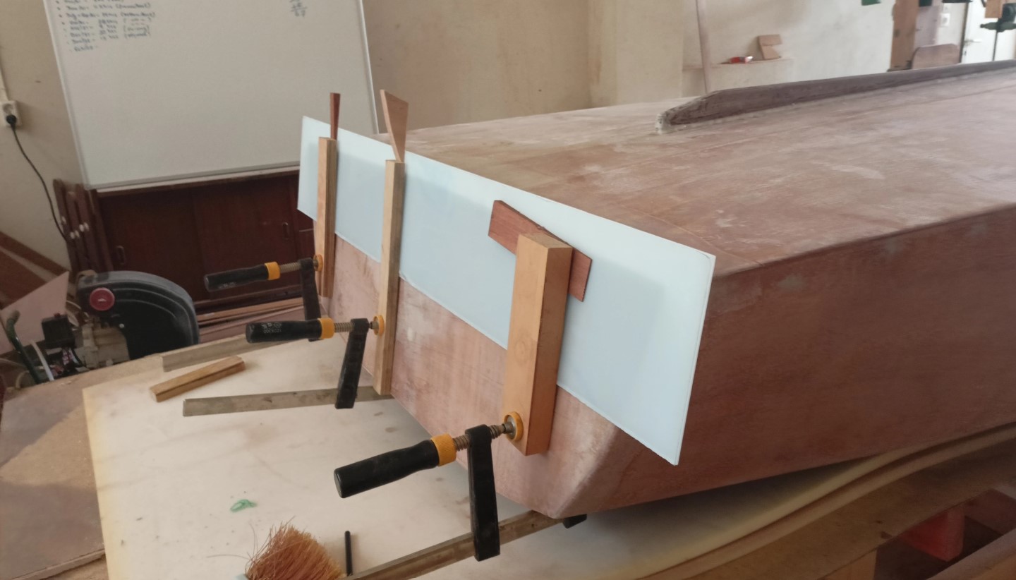 Για την εγκατάσταση αρχικά εκοψα στο ίδιο μήκος όλα τα διαμήκη ξύλα στο μπροστινό μέρος που καταλήγουν στο ταμπλό. Κολληθηκαν τακοι με την κλίση στα πλαϊνά ξύλα (coamings) πάνω στους οποίους θα κολληθούν τα άκρα του ταμπλό και φαγώθηκαν τα διαμήκη ξύλα έτσι ώστα να ταιριάξει το ταμπλό πάνω τους.