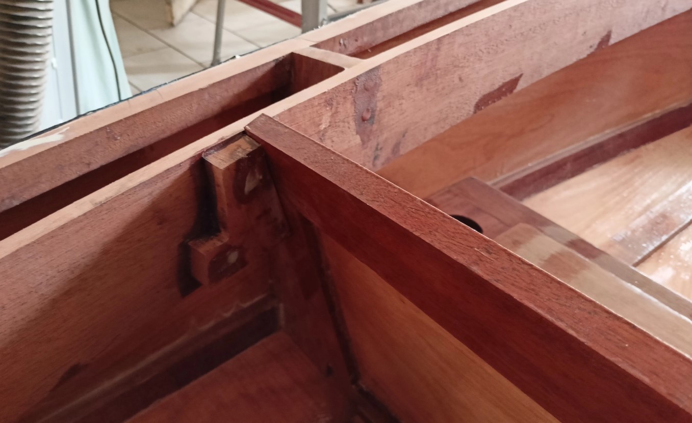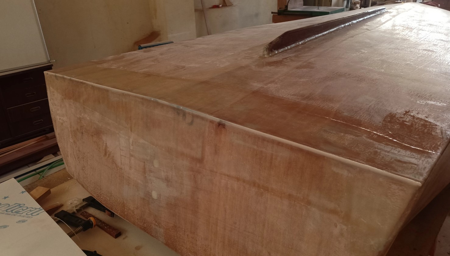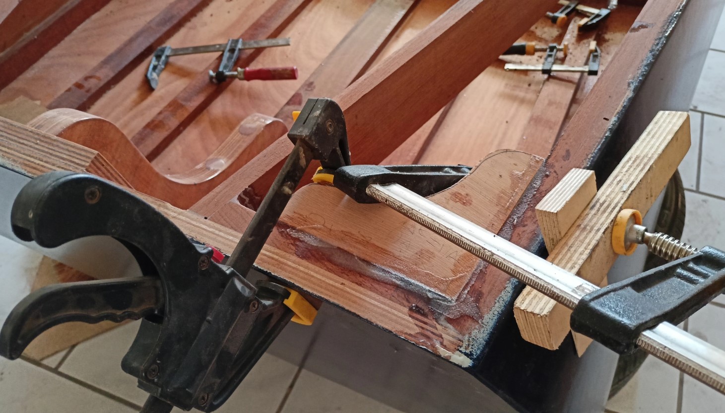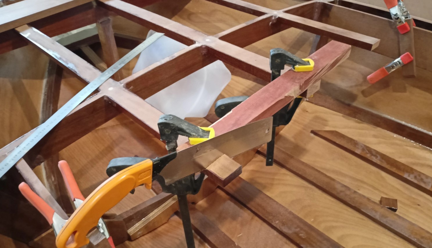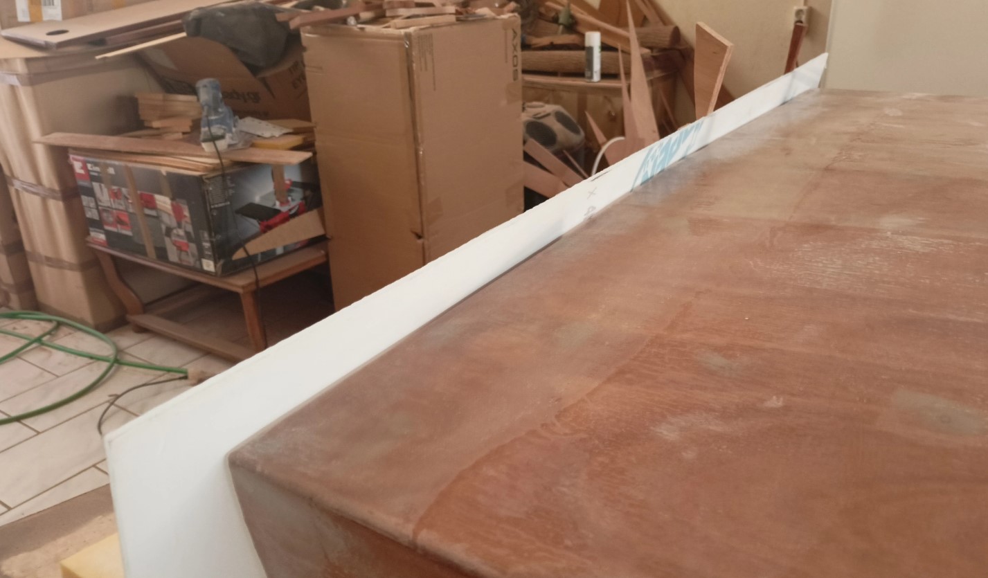 Για την εγκατάσταση αρχικά εκοψα στο ίδιο μήκος όλα τα διαμήκη ξύλα στο μπροστινό μέρος που καταλήγουν στο ταμπλό. Κολληθηκαν τακοι με την κλίση στα πλαϊνά ξύλα (coamings) πάνω στους οποίους θα κολληθούν τα άκρα του ταμπλό και φαγώθηκαν τα διαμήκη ξύλα έτσι ώστα να ταιριάξει το ταμπλό πάνω τους.