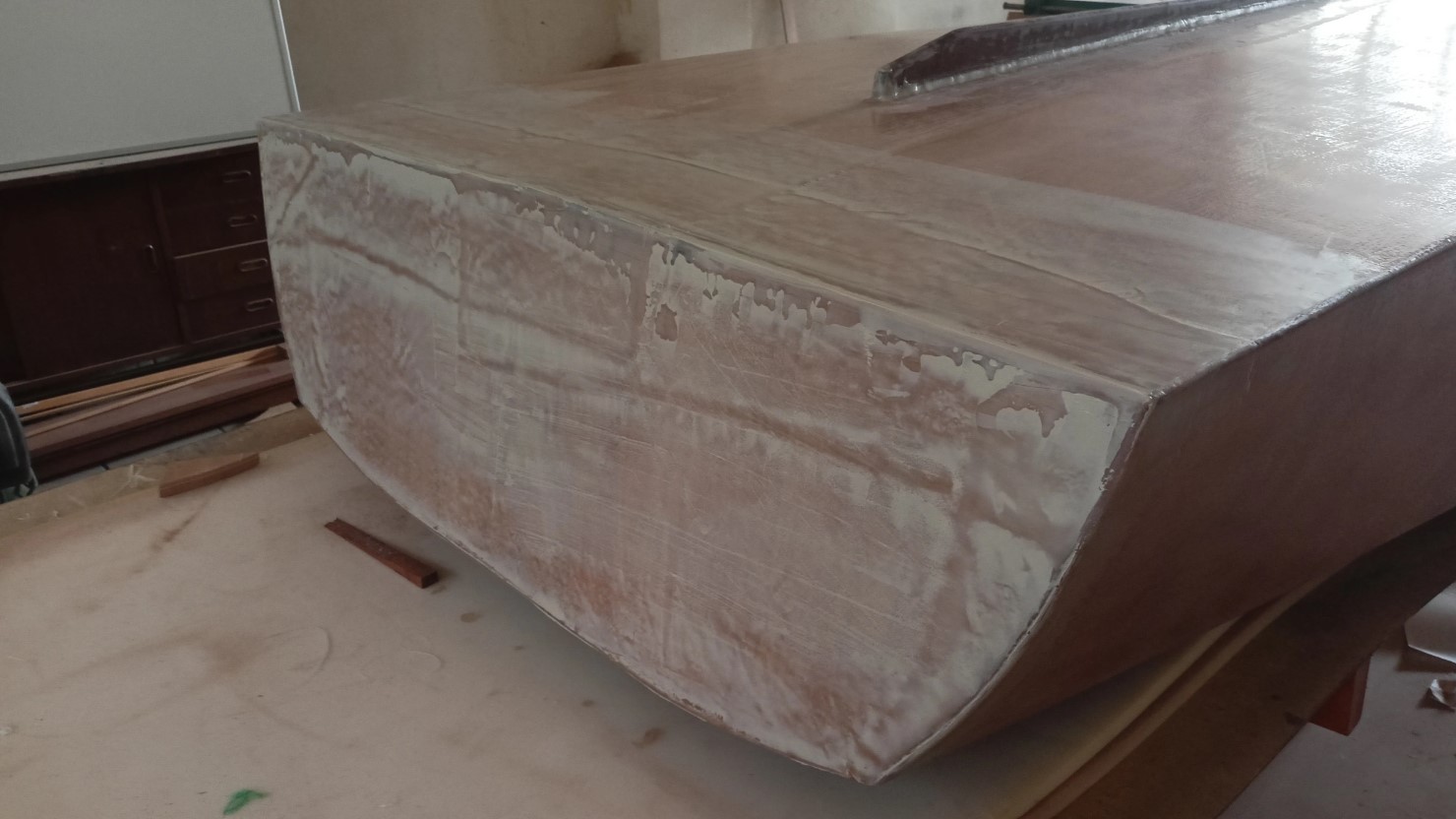 Το αποτέλεσμα είναι άκρως απογοητευτικό. Απο κοντά φαίνονται πολλές φουσκάλες που έχουν δημιουργηθεί στην επιφάνεια. Αυτό ίσως οφείλεται στην πολύ ζέστη που είχε το καλοκαίρι το εργαστήριο. Ισως να μην έφταιγε αυτό και να μην είχα τη σωστή αραίωση με το διαλυτικό. Οτι και να φταίει, θα το ανακαλύψω ελπίζω το χειμώνα. Αποφάσισα να σταματήσω να ασχολούμαι άλλο με το βάψιμο. Θα γυρίσω το σκάφος πάλι και θα συνεχίσω με τις εργασίες στην εσωτερική του μεριά.