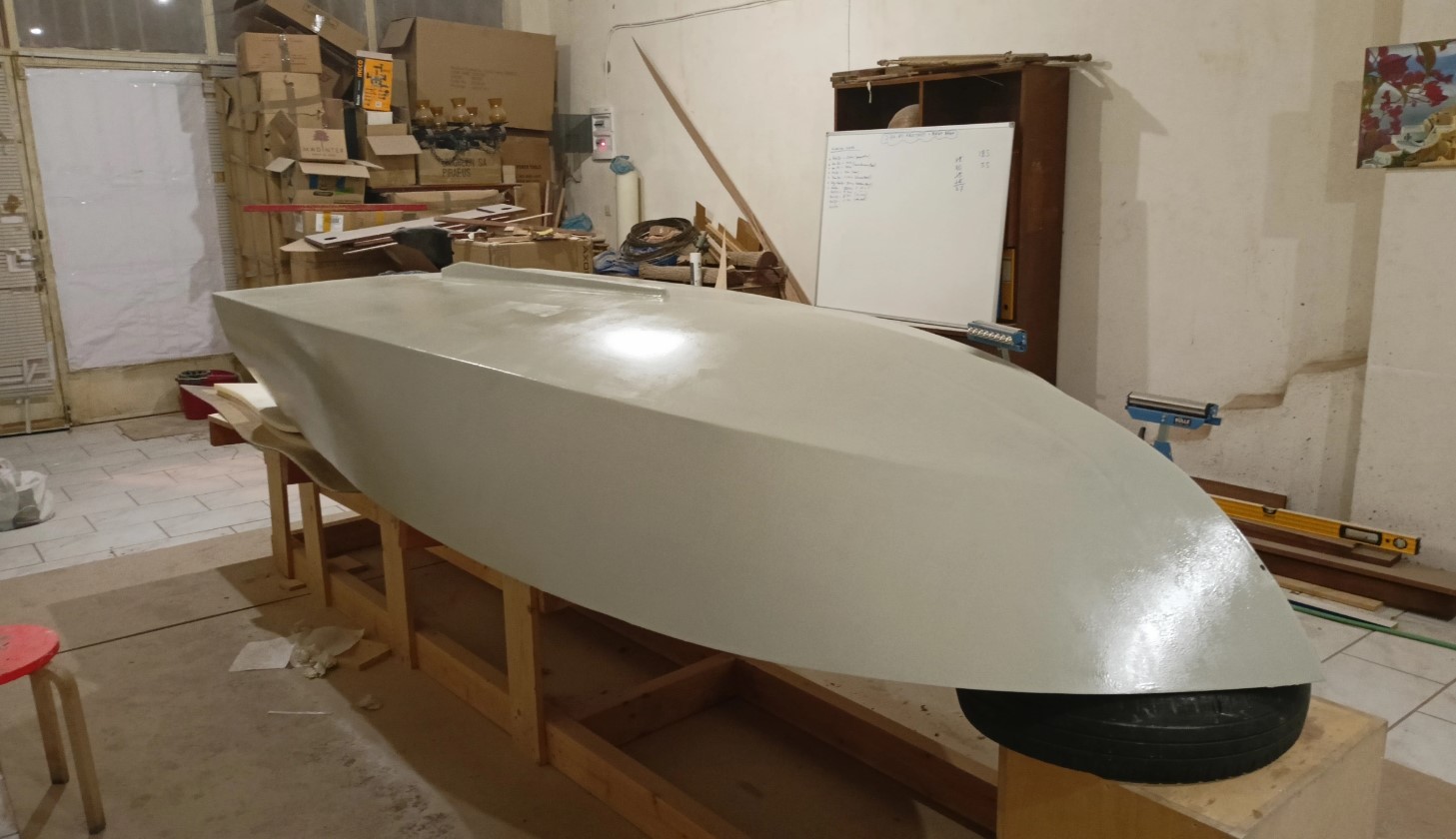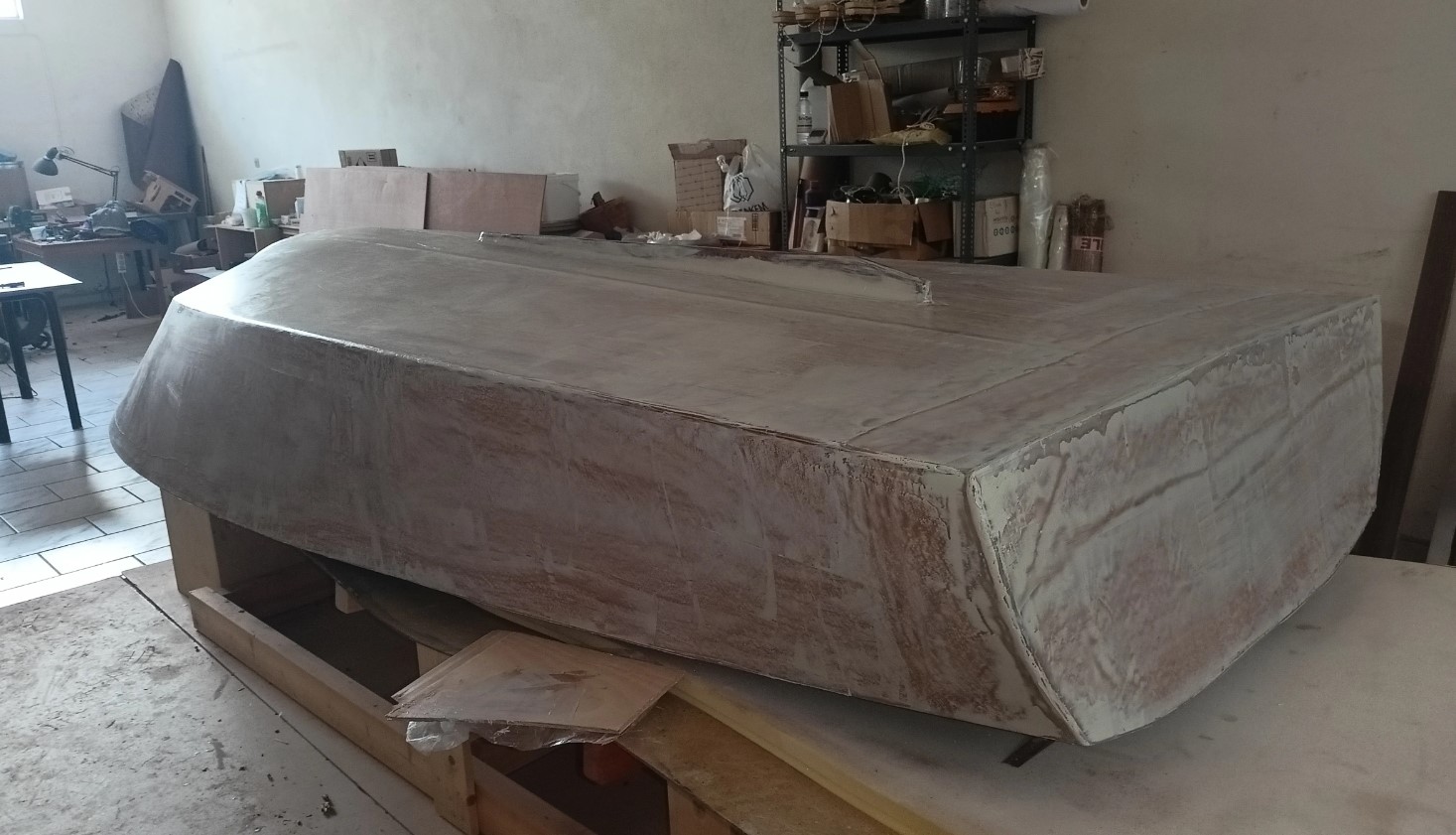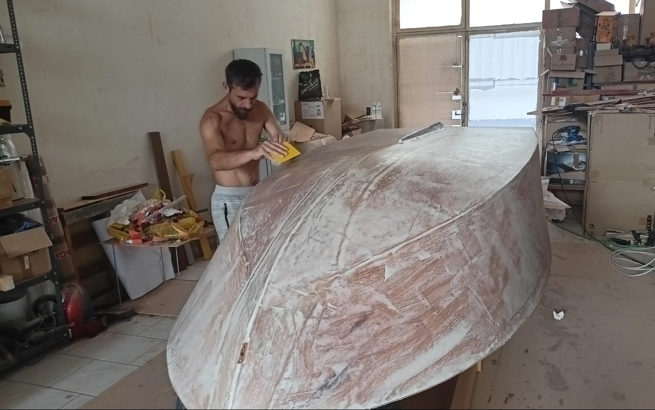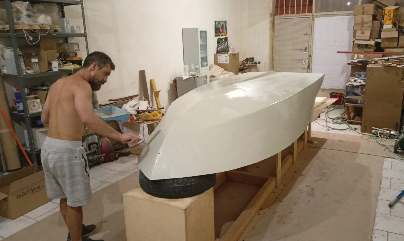 Αφού ολοκληρώθηκε η μορφοποίηση περιμετρικά του σκάφους ήρθε η ώρα για να ξανατουμπάρει για να ολοκληρωθούν οι εργασίες στη γάστρα. Αυτές είναι το πέρασμα τεσσάρων ακόμα χεριών ρητίνης, η τοποθέτηση της καρίνας, η δημιουργία γωνίας στον καθρέφτη για να αποφύγουμε σπηλαίωση του νερού (για να κολληθεί το υαλούφασμα είχε στρογγυλέψει η ένωση), το πέρασμα εποξικού στόκου για το τέλειο φινίρισμα, του εποξικού ασταριού και της τελικής βαφής. Το τουμπάρισμα έγινε με τη βοήθεια δύο φίλων του Γιάννη και του Ηρακλή. Το σκάφος παραμένει πάρα πολύ ελαφρύ