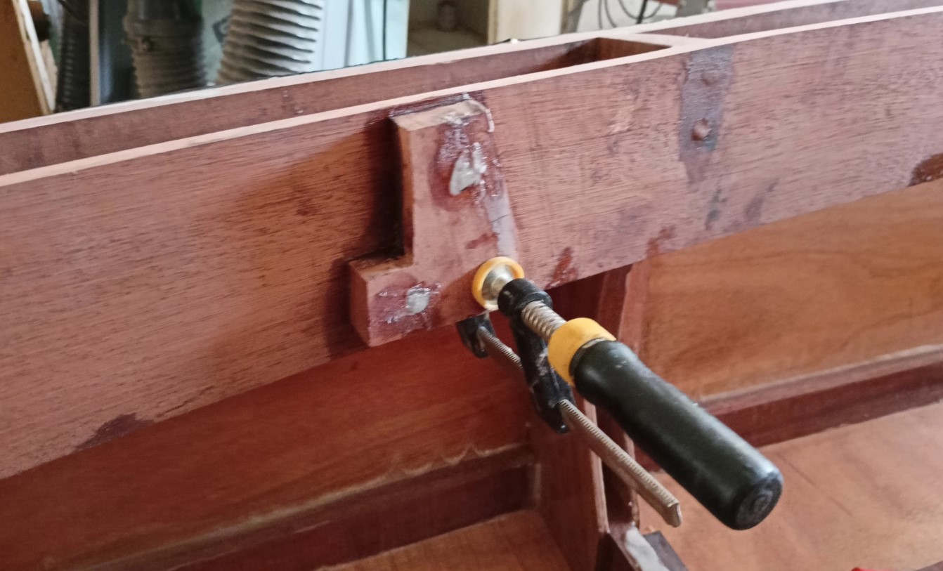 Κολλήθηκαν οι τάκοι που θα ενισχύσουν το πίσω ξύλο του ντουλαπιού και στη συνέχεια το ίδιο το ξύλο με την ίδια καμπύλη που έχουν και τα υπόλοιπα κάθετα.