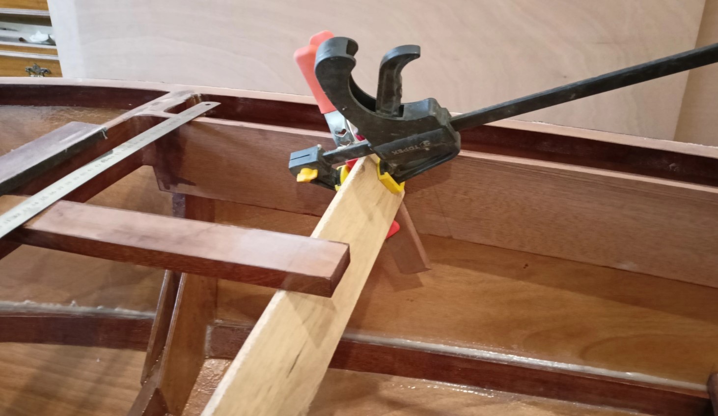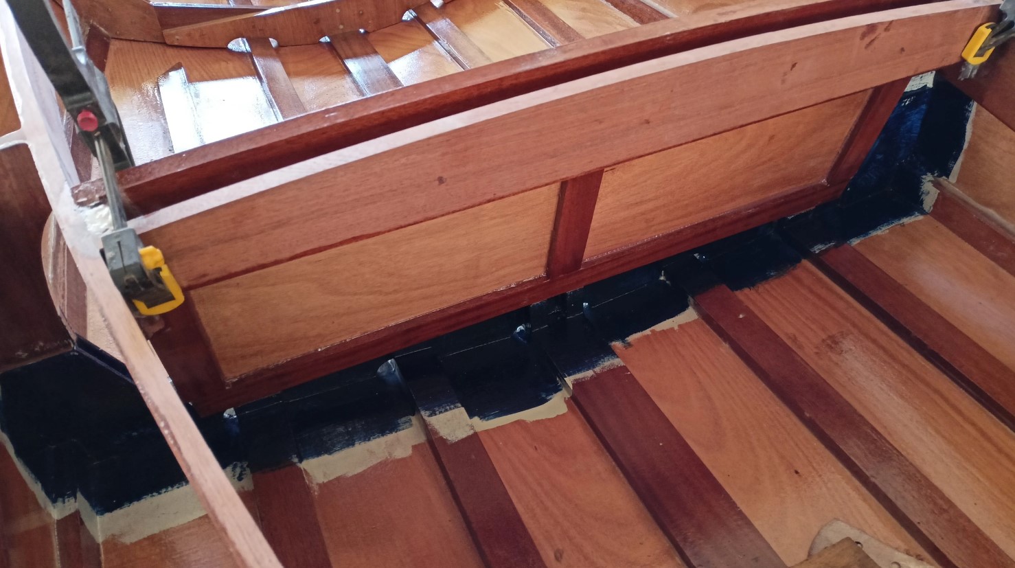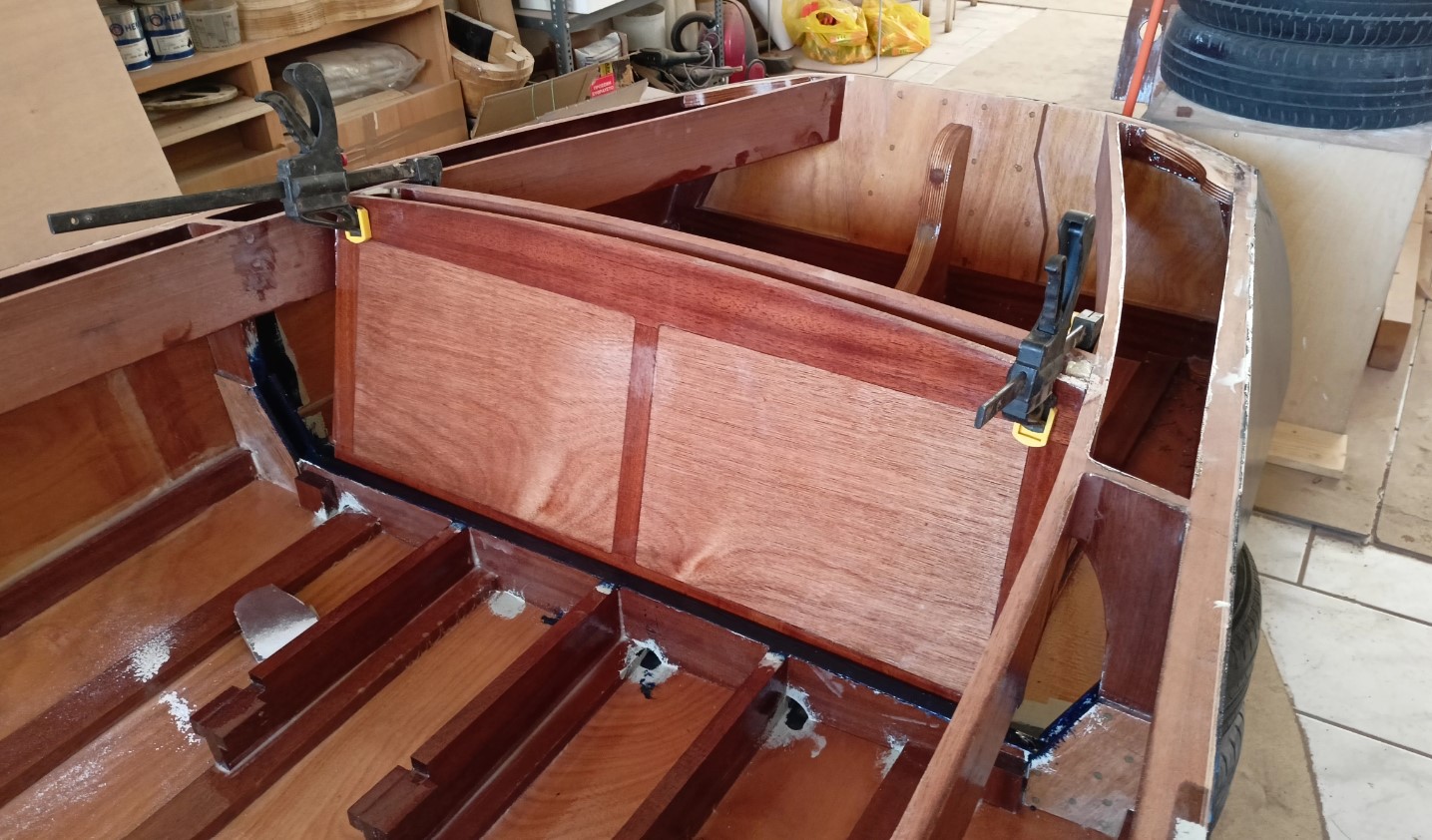 Οι εργασίες που πρέπει να γίνουν είναι να κολληθεί η πλάτη του καθίσματος και τα ξύλα στο πίσω μέρος του σκάφους που θα γίνει το ντουλάπι και η τρύπα της μηχανής. Κόπηκαν τα κάθετα ξύλα πίσω απο την πλάτη του καθίσματος και το τελευταίο πριν την τρύπα. Το τελευταίο δε θα κολληθεί πριν τοποθετηθεί η μηχανή για να δω τη θέση του.