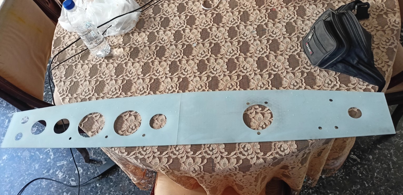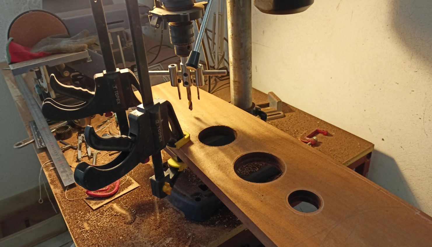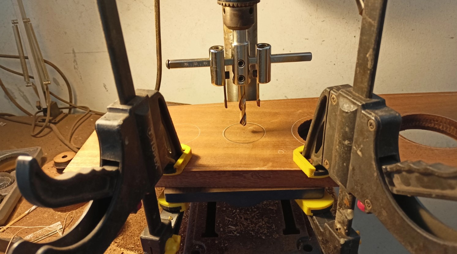 Για το κόψιμο των οπών φτιάχτηκε template στο laser ώστε να γίνει το φινίρισμα κατά την επεξεργασία με το ρούτερ. Οι μεγαλύτερες τρύπες ανοιχθηκαν με το εργαλείο που φαίνεται στις φωτογραφίες, ενώ οι μικρότερες με το ποτηροτρύπανο, σε λίγο μικρότερο μέγεθος. Στις μεγάλες το ποτηροτρύπανο δεν τα κατάφερε.