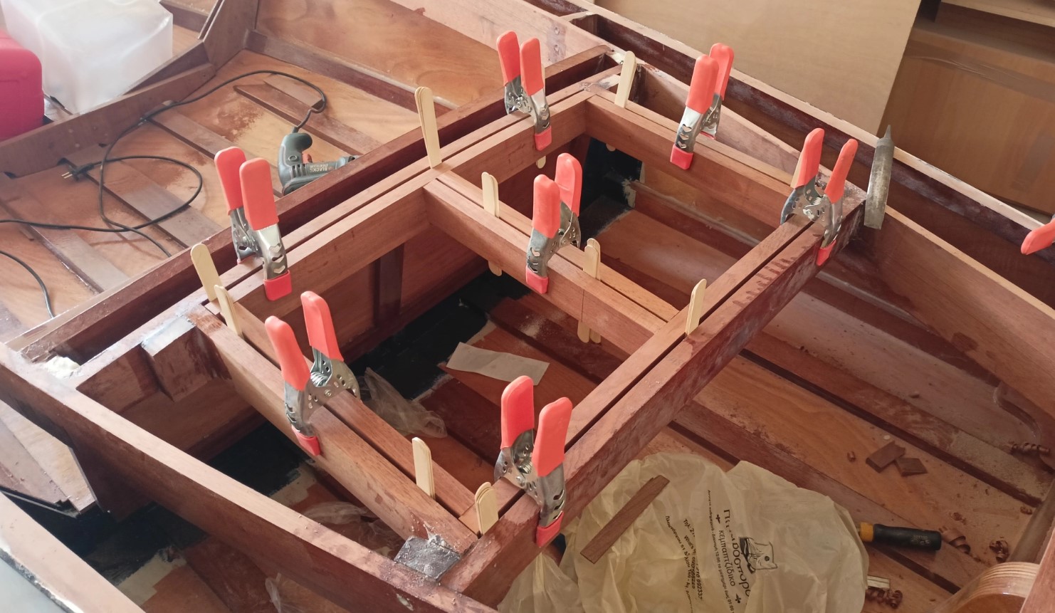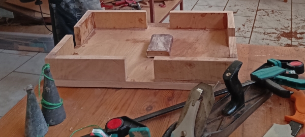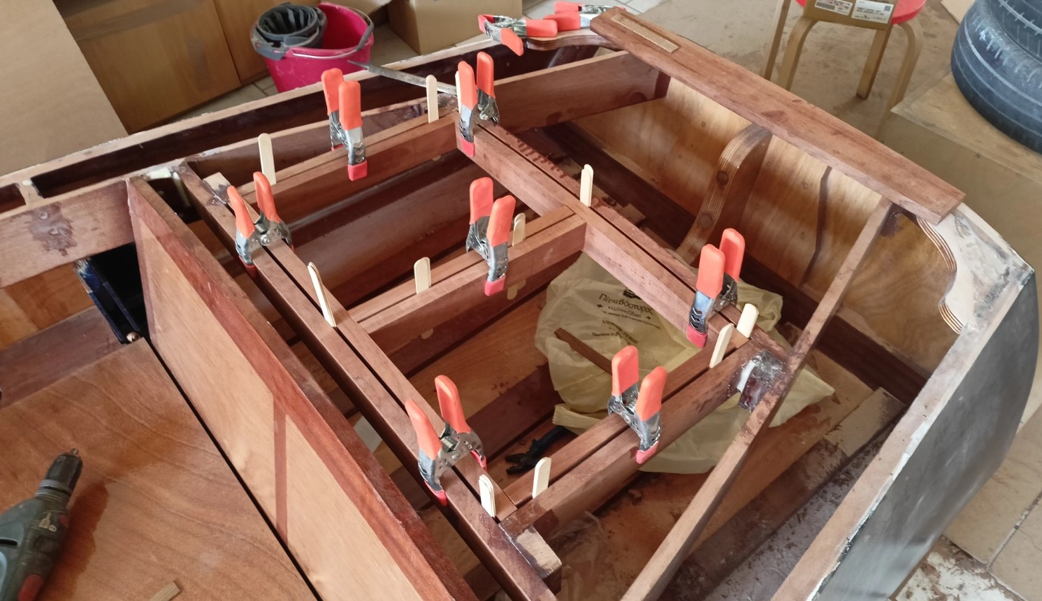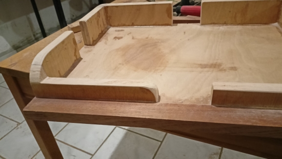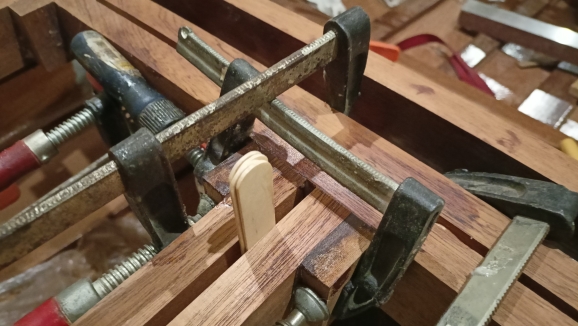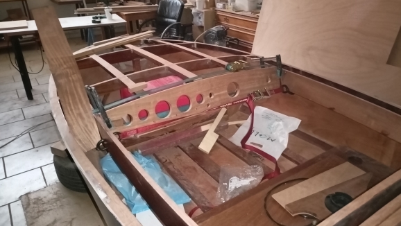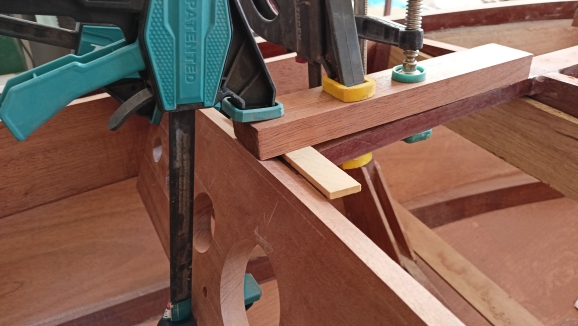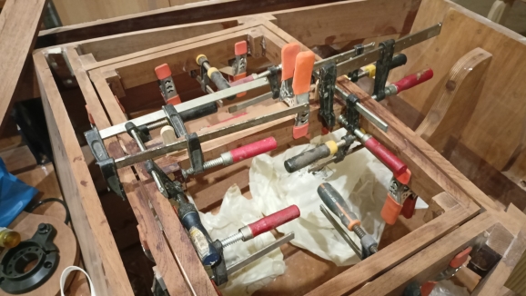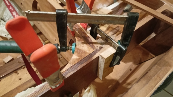 Μια απο αυτές είναι η κόλληση των εσωτερικών ξύλων του ντουλαπιού. Τελικα αποφασίστηκε να ανοιγουν δύο πορτάκια, ένα αριστερα και ένα δεξιά για να υπάρχει εύκολη πρόσβαση στη μηχανή. Το κενό μεταξύ των δύο ξύλων υπολογίστηκε στα 6 χιλιοστά για να μπορούν να ανοίγουν χωρις να βρίσκει το ένα ξύλο στο άλλο. Όλες οι κολλήσεις έγιναν όπως είναι το ντουλάπι πιασμένο για να μην χάσω τις καμπύλες