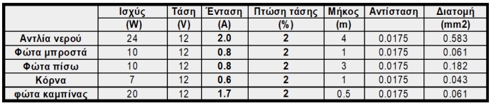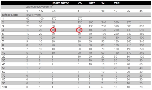 ΔU=ρ*(L/S)*(P/V)<=2%, οπου ρ η ειδική αντίσταση του αγωγού, L το μήκος σε μ, W το φορτίο σε watt, S η διατομή του αγωγού σε mm2, V η τάση του αγωγού που στη περίπτωση μας είναι 12 volt.