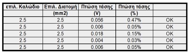 Ο υπολογισμός της διατομης των καλωδίων γίνεται με βάση τη μέγιστη αποδεκτή πτώση τάσης, η οποία δεν πρέπει να ξεπερνά το 3-4%.