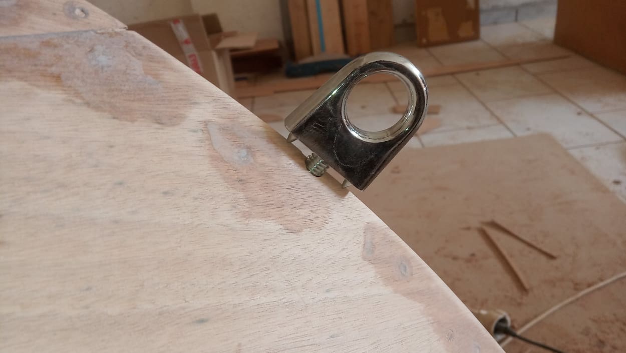Αρχικά ανοίχτηκε η τρύπα στα κόντρα πλακε που θα εγκατασταθεί η μπροστινή δέστρα. Να τονίσω ότι η τρύπα στην καρίνα είχε ανοιχτεί πριν κολληθεί στο υπόλοιπο σκάφος και πριν φυσικα κολληθούν τα κόντρα πλακε. Αυτό είχε φυσικά το θετικό ότι η εργασία έγινε στο δράπανο με πολυ σωστό αποτέλεσμα.