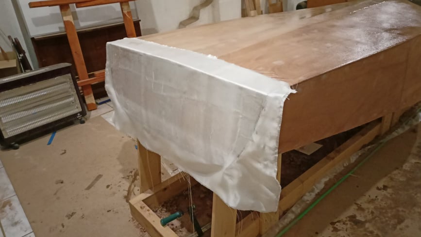 Το σκάφος είναι έτοιμο για να περαστεί το υαλούφασμα. Επιλέχθηκε η στεγνή μέθοδος. Το υαλούφασμα θα τοποθετηθεί πάνω στο σκάφος χωρίς να έχει περαστεί αρχικα με ρυτίνη. Αρχικά επέλεξα ρυτίνη west system 742, η οποία είναι 200 gr/m2 και έχει πλάτος 150 εκατοστά. Ήθελα να βάλω δυο κομμάτια ρυτίνης, ένα αριστερά και ένα δεξιά της καρίνας με επικάλυψη αυτής (και ένα φυσικά στον καθρέφτη). Το μέγιστο πλάτος που θα χρειαζόμαι είναι 115 εκατοστά, οπότε τα περισσότερα υαλουφάσματα των 100 εκατοστών πλάτους απορρίφθηκαν. Δυστυχώς η ρυτίνη αυτή δεν ήταν ετοιμοπαράδοτη και έτσι συνέχισα το ψάξιμο. Κατέληξα στην Fiberglass fabric G213S, της εταιρίας FIBERMAX Ltd με βάρος 213 g / m2, πλάτους 120 εκατοστών και με τα παρακάτω στοιχεία:
