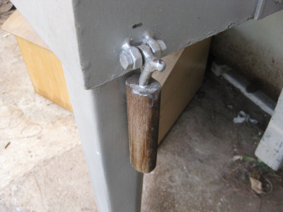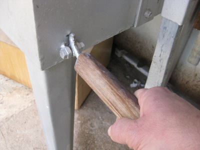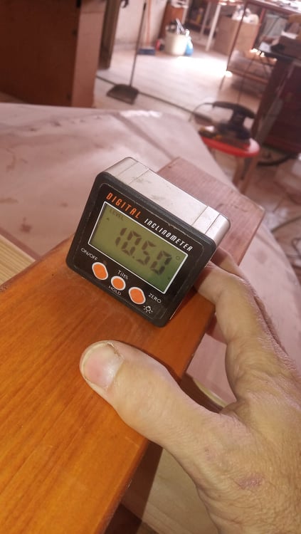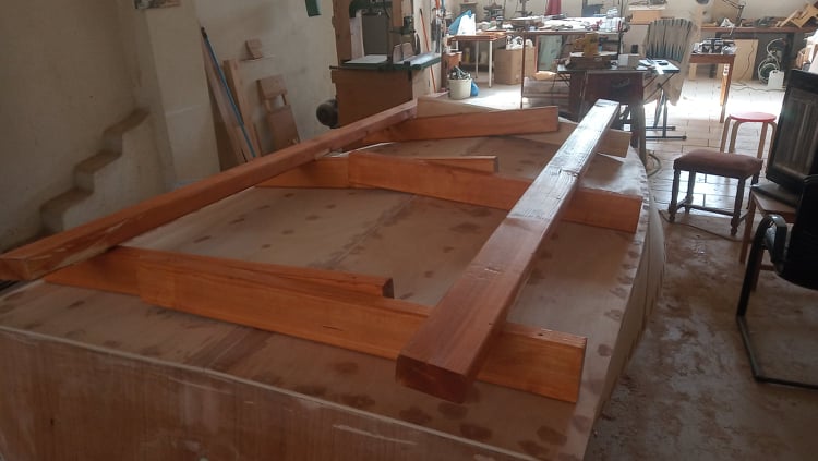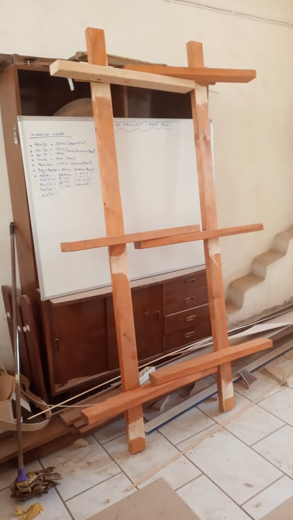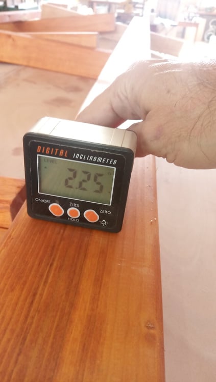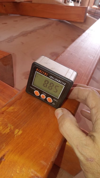 Επείδη τα παράλληλα μεγάλα ξύλα δεν είναι κάθετα στο επιπεδο της κάτω βάσης έπρεπε να μπουν σφήνες για να βιδωθούν στη σωστή κλίση. Για να γίνει αυτό μετρήθηκε η γωνία και κόπηκαν κατάλληλες σφήνες.