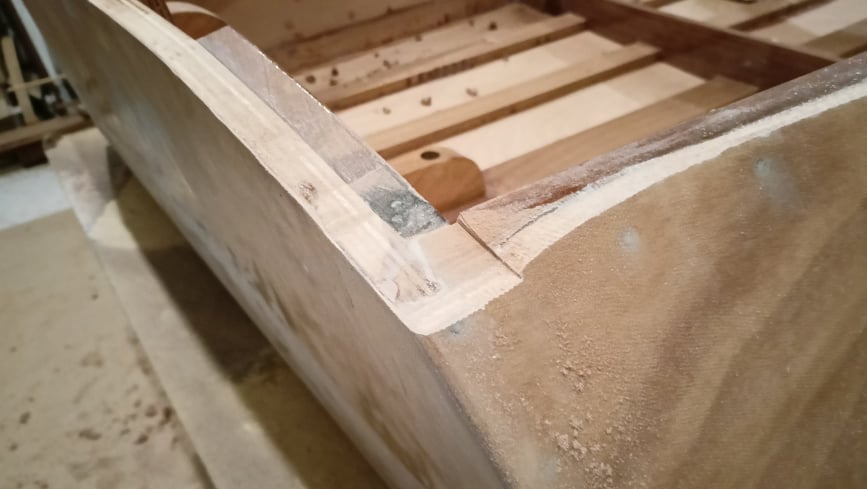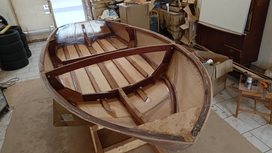 Μία εργασία που πρέπει να γίνει σίγουρα είναι ο καθαρισμός εσωτερικά του σκάφους απο τις ρυτίνες που έχουν τρέξει. Επίσης, να ενισχυθεί στα κάθετα ξύλα που είναι κολλημένο το κόντρα πλακέ με ρυτίνη και microfiber.