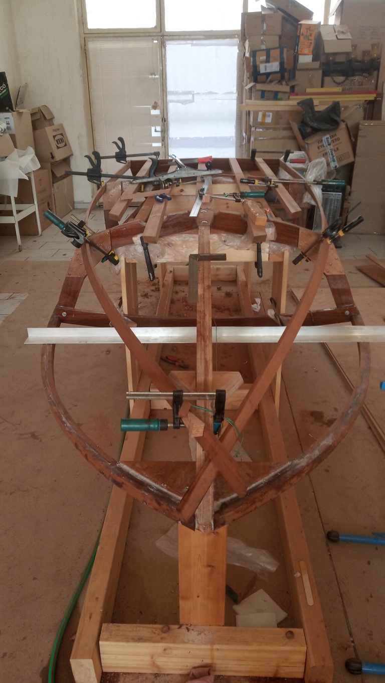 Κολληθηκαν πρωτα τα σημεια στον καθρέφτη και στον πρωτο νομεα που δε χρειαζοταν ιδιαιτερο λυγισμα.Στη συνεχεια ζεσταθηκαν με τη συσκευη και κολληθηκαν στο δεύτερο νομεα.Επελεξα να κολλησω στο τελος στο μπροστινο σημειο για να δω σε πιο σημειο θα πρεπει να κολληθει το βοηθητικο ξυλο. Ενα προβλημα που μπορει να παρουσιαστει ειναι τα ξυλα αυτα να βρισκονται πιο χαμηλα απο την επιφανεια που σχηματιζει το κοντρα πλακε που ενωνει το ξυλο του καταστρωματος και της καρινας. Αν συμβει αυτο θα χαλασει η μορφη του σκαφους μπροστα (V). Όσο πιο ψηλα (οπως ειναι αναποδα η βαρκα) τοσο πιο ψηλα ανεβαινει το ξυλο απο την επιφανεια αλλά δυσκολευει καθως η φυσικη του συνεχεια ειναι να παει προς τα κατω (πρεπει να καμπυλωσει με τη θέρμανση). Τα σχεδια δεν αναφερουν που πρεπει να πιαστουν. Λενε οτι δεν εχει ιδιαιτερη σημασια.