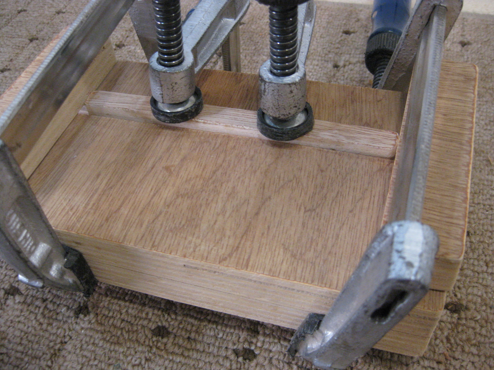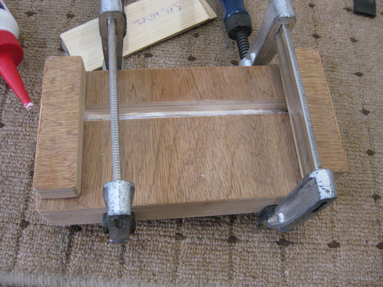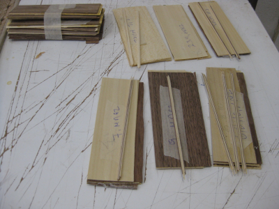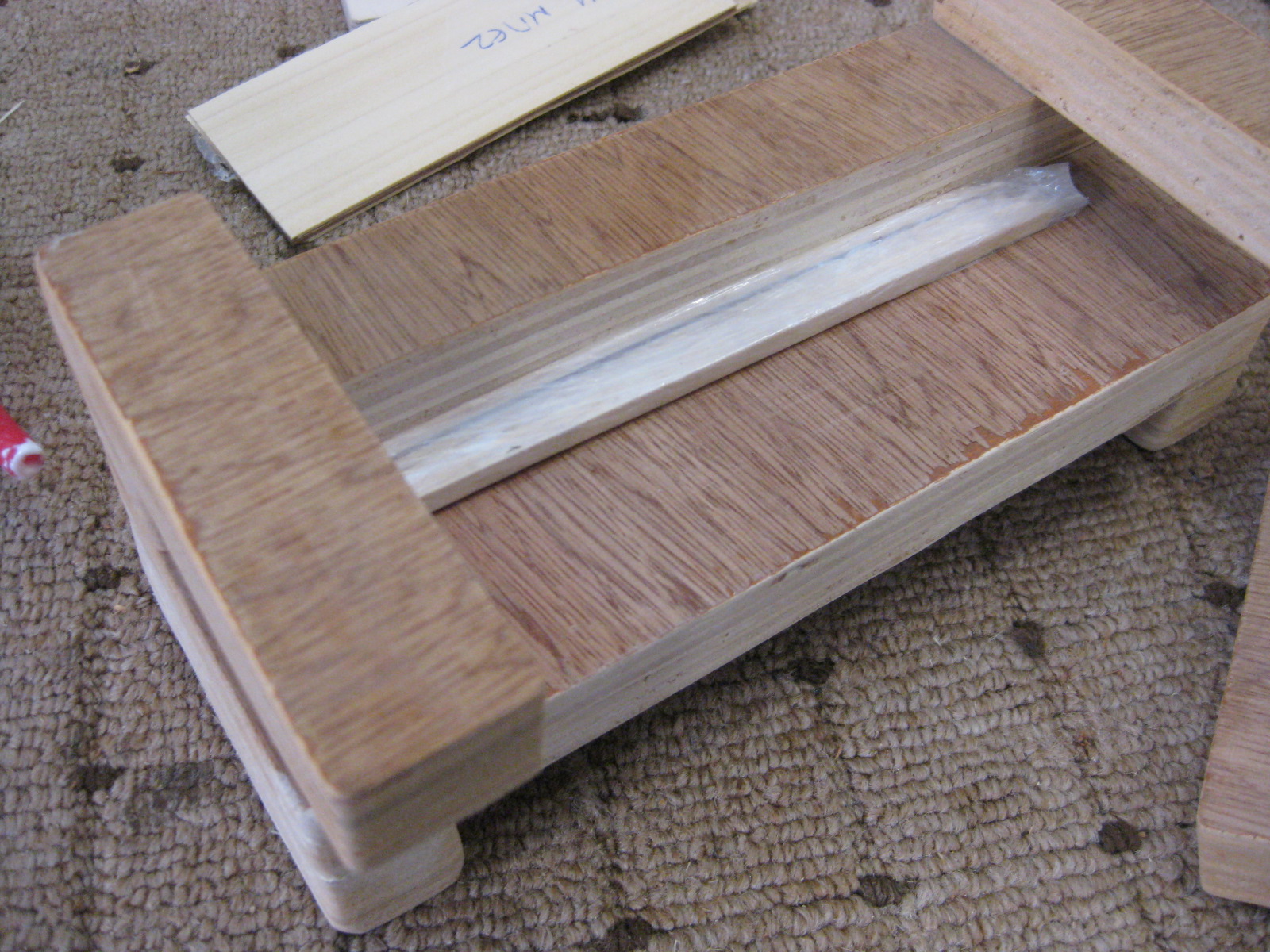 αφου φτιαξω με τη σειρα τις λωριδες, βαζω κολλα, τυλιγω το μπαστουνακι με ναυλον (οχι το λεπτο, το παχυ θελει) το βαζω μεσα, κουμπωνει απο πισω η "πρεσα" και βαζω τα πρωτα 2 σφικτηρακια στη πρεσα για το μηκος, βαζω το αλλο ξυλακι απο πανω (οπως ειπα το Νο.12 η το 13) και τα αλλα 2 σφικτηρακια απο πανω, και μετα 1 ωριτσα τα ξεκουμπωνω, βγαζω ναϋλον, και μετα αλλη μια-δυο ωρες εξω μονο του (γιατι δεν στεγνωνει καλα η κολλα μεσα στο τυλιγμα του ναϋλον) και ειναι κομπλενταν, ετοιμο για κοψιμο με λεπτο πριονακι.