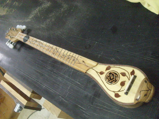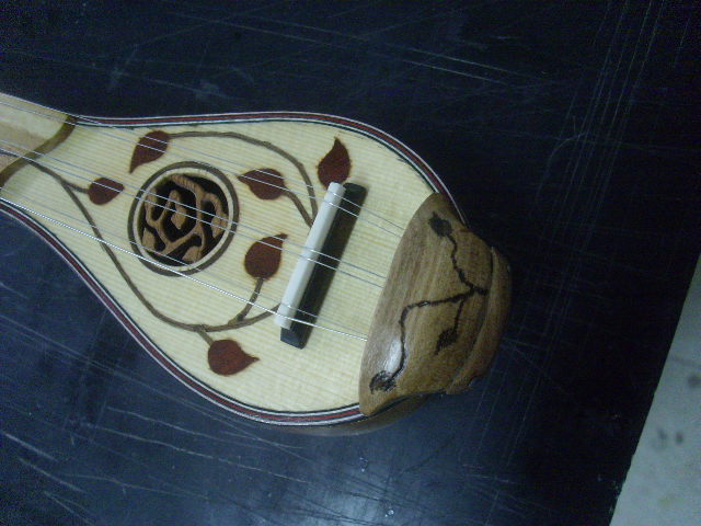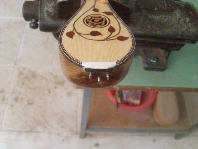 Και καπως πιο αναλυτικά η χορδιέρα . Βιδώθηκαν τρια γαντζάκια . Με την χειροκίνητη τριβιέρα , που αναφερθηκε πιο πανω , ετριψα ενα κοκκαλακι ( απο το πιο πανω κοκκαλο ) στο παχος 0,4 mm. Το κολησα στο χείλος του καπακιου εκει , που οι χορδες ακουμπαν στο καπακι για να μην το πληγώνουν  . Στο χείλος του σκαφους κόλλησα μια λοριδα εβενο , που επισης έφερα σε παχος 0,3 mm ( για να μπορει να λυγίζει ) . Παρακατω φαίνονται ελπιζω τα ως ανω αναγραφόμενα και η δευτερη χορδοκαλύπτρα , που διακοσμήθηκε με κολλητήρι ( γιατι δεν εχω πυρογραφο ) .