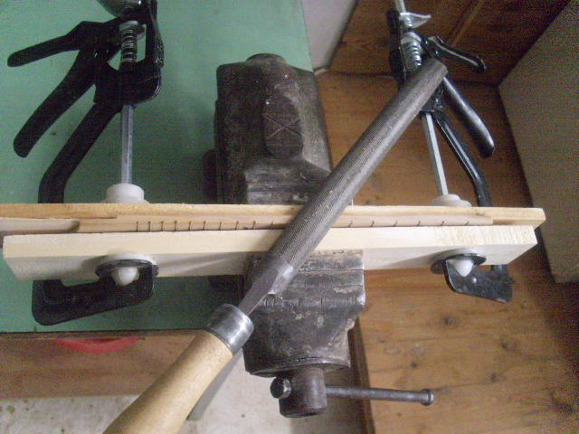 Η σημερινη συνέχεια : κατασκευη ταστιερών . Αναρτήθηκα απο την αρχη της μύησής μου στον χώρο , γιατι η ταστιερα πρεπει να ειναι απο εβενο . Δεν βρηκα καμια πιστική απαντηση . Ειχα καποια κορμάκια ελιας ( ειχαν παγωσει προ τριετιας 5-6 δεντρα του μαπατσανακι του γείτονα και τα προοριζε για καψιμο - του βουτηξα 3 πενινταποντα κουτσουρακια ) . Εν'απ'αυτα το ειχα κανει σανιδακια 1,5 ποντου παχους . Απο εν'απ'αυτα τα σανιδακια γιναν οι δυο ταστιερες . Αρχικα κοπικαν με πριονι :