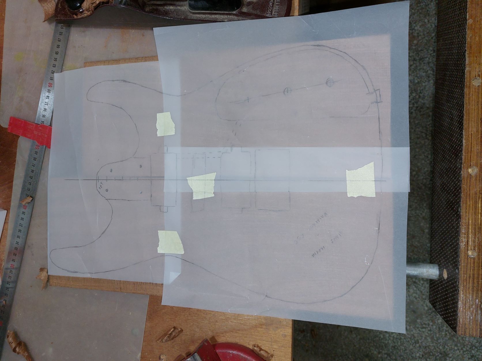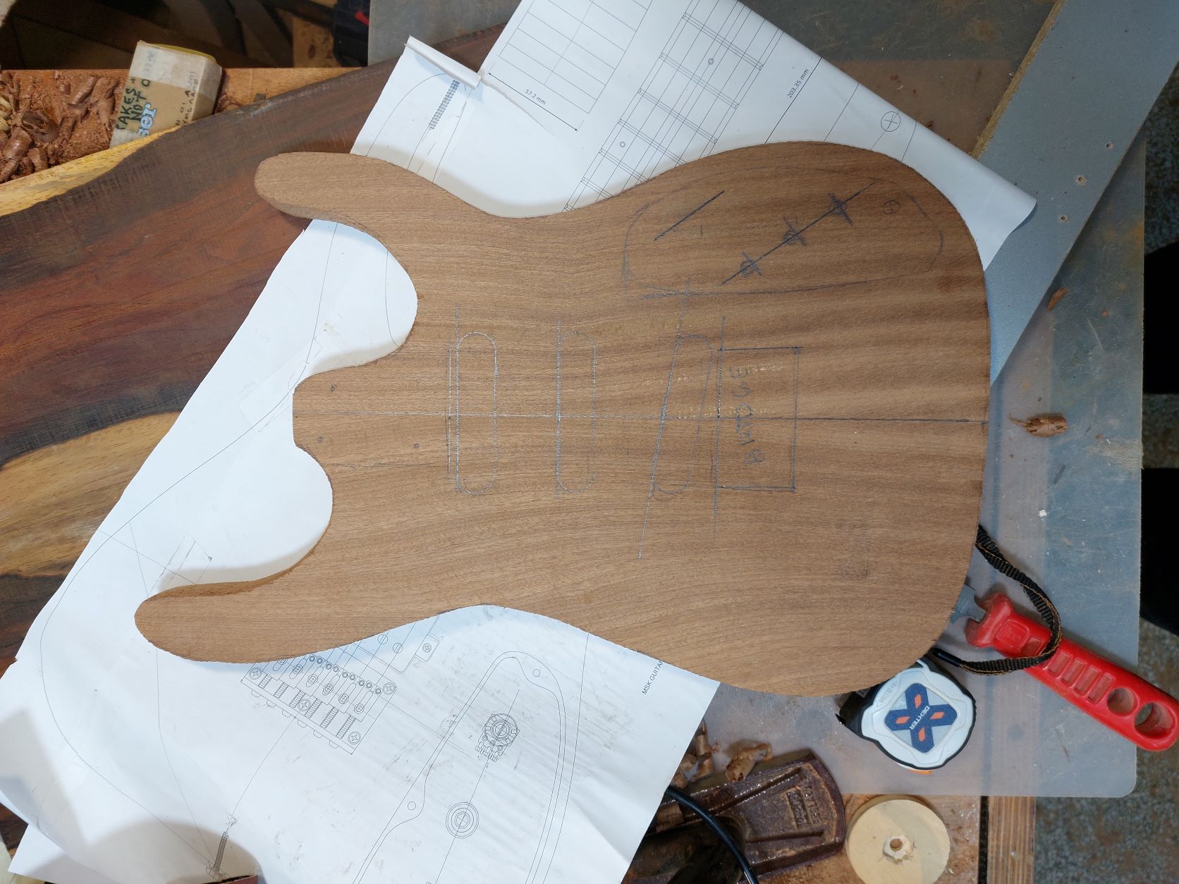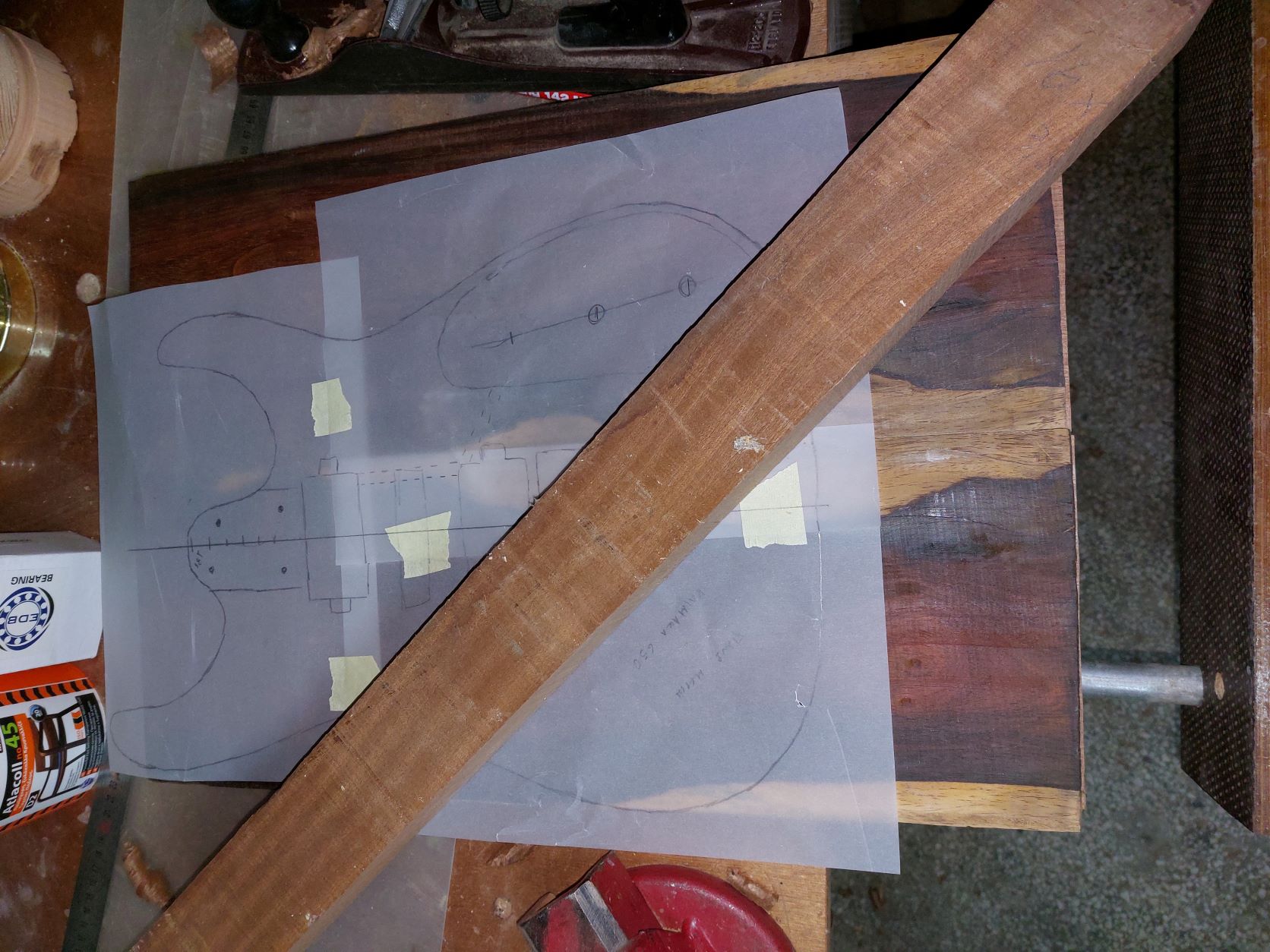 Προχωρώντας η κατασκευή θα μπούμε σε πιο πολλές λεπτομέρειες, αλλά τώρα ας πούμε για τα πρώτα υλικά.Την προηγούμενη εβδομάδα κόλλησα τα 2 κομμάτια κοκομπόλο.Σήμερα έκοψα το μαόνι αγορασμένο το 2013 και έβγαλα τα δυο κομμάτια για το σκάφος καθώς και από το ίδιο μαδέρι το μαόνι για το μονοκόμματο μπράτσο.Ανεβάζω τις φωτογραφίες από τα ξ'ύλα καθώς και το σχέδιο οδηγό της κιθάρας σε ρυζόχαρτο.Πλάκα-πλάκα βγήκαν πολύ όμορφα τα νερά του μαονιού. Δεν το περίμενα τόσο όμορφο.Έπεται συνέχεια.