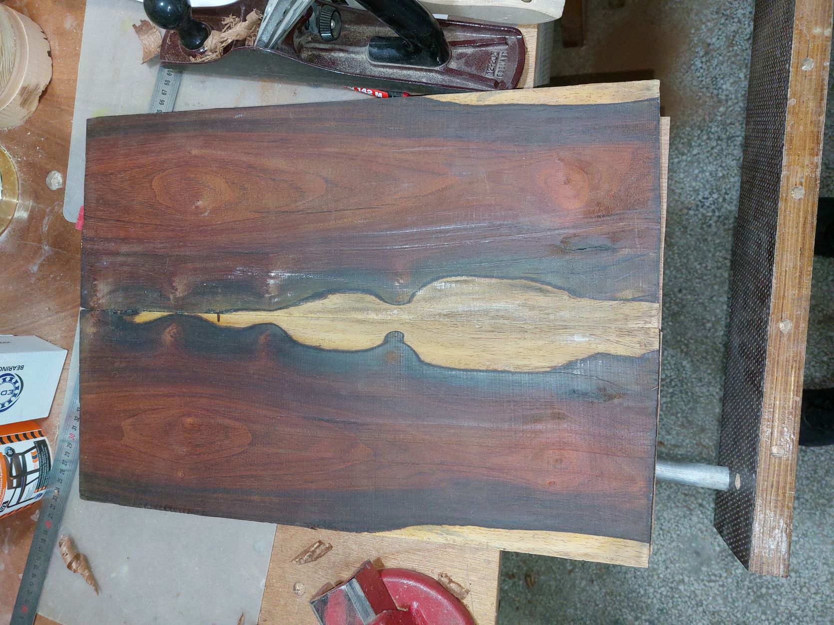 Πάνω στο κελεμπέκι θ ακολληθεί το κοκομπόλο, έτσι όταν οι ακμές στο καπάκι θα ''σπάσουν''  και θα στρογγυλευθούν θα εμφανιστεί ασπρόμαυρο περιμετρικά στην ένωση με το μαόνι. Παρόμοιος χρωματικός συνδυασμός επιλέχθηκε και για την ταστιέρα η οποία κολλήθηκε σάντουιτς, έβενος, κελεμπέκι μουαρέ και μαύρος καπλαμάς για να κολληθεί σε μπράτσο από μαόνι.