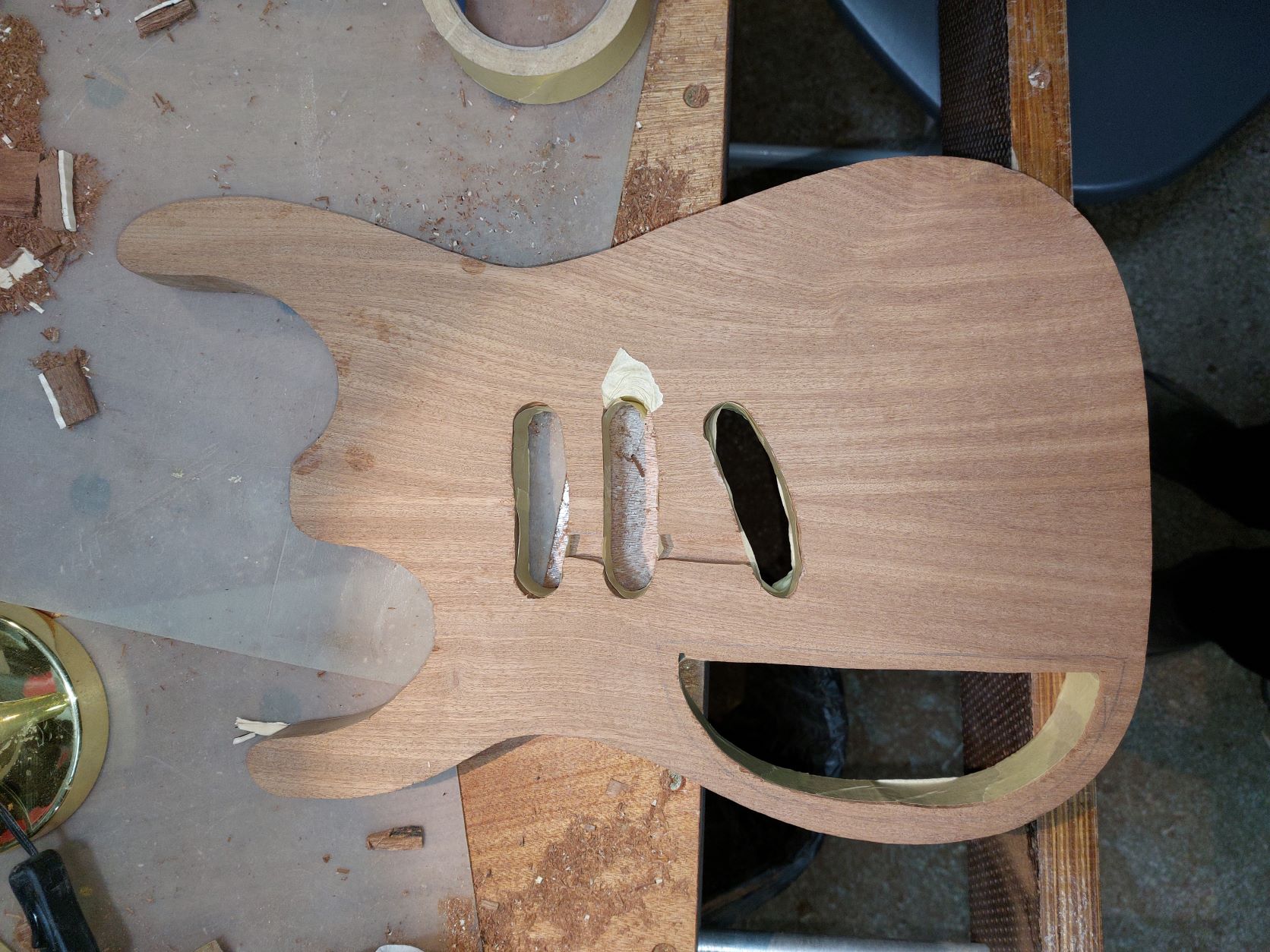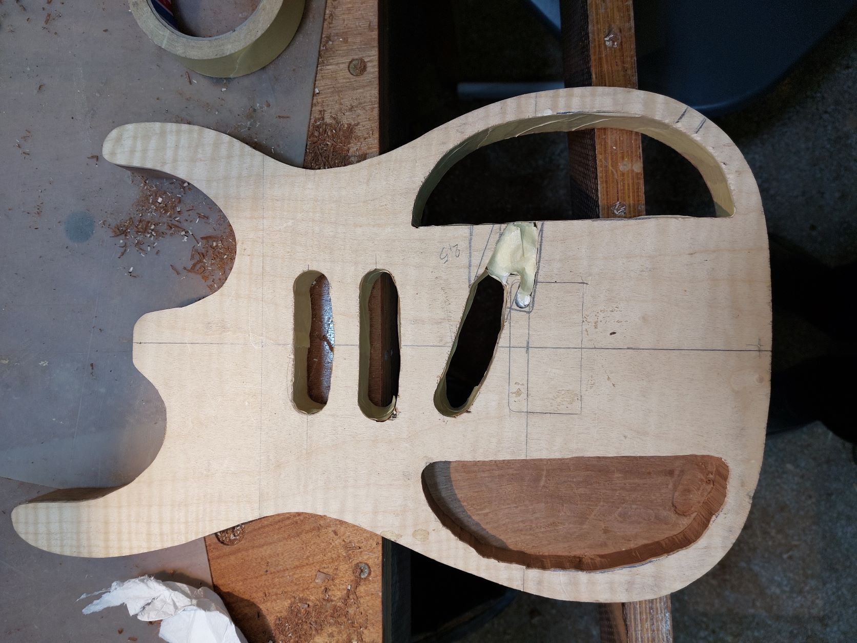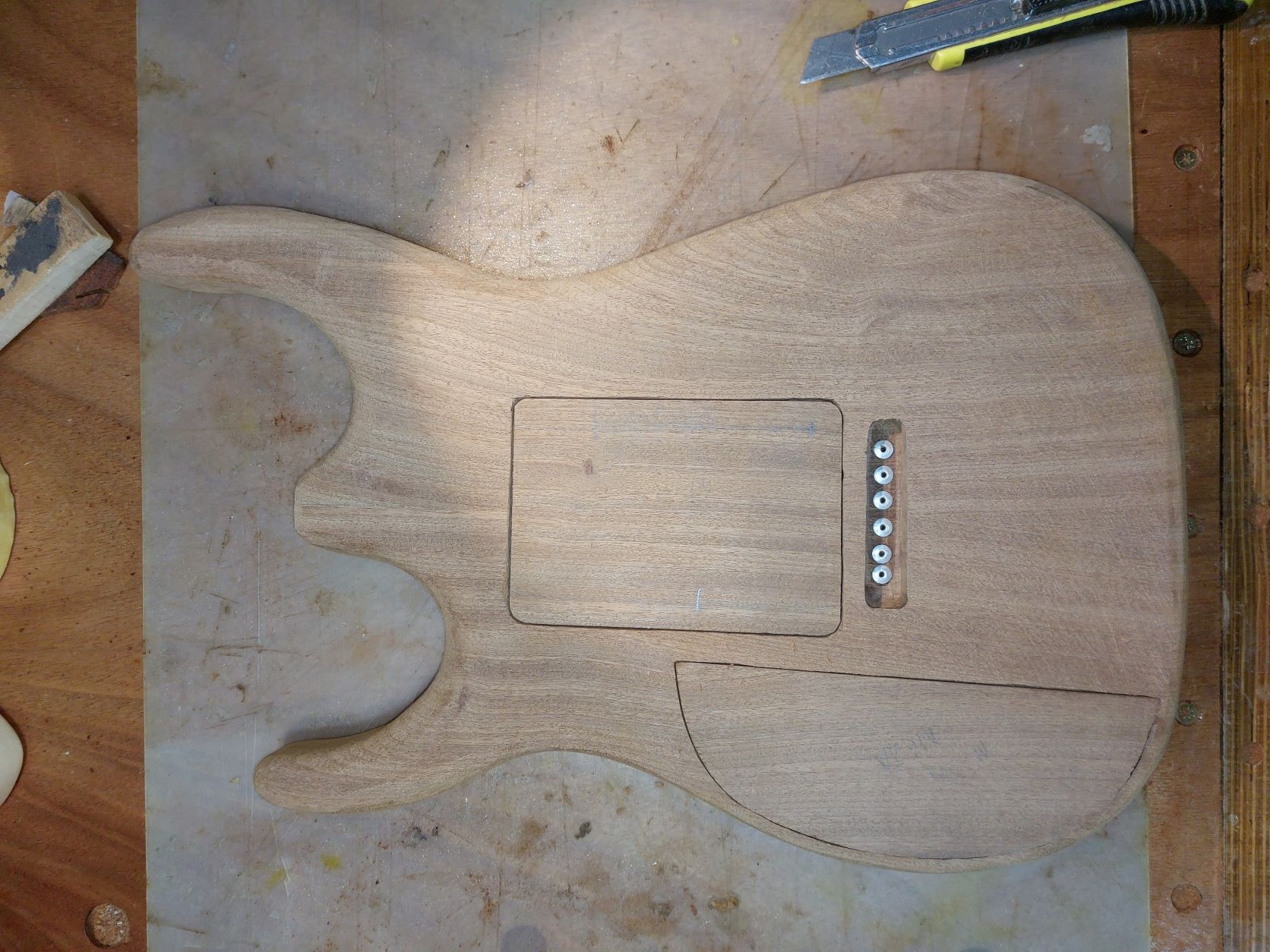 Προχωρήσα λίγο και αυτήν την κιθάρα. Αφού σκαφτήκαν με ρούτερ οι υποδοχές για μαγνήτες και ηλεκτρικά στο σώμα, δημιουργήθηκε κενό και συμμετρικά της υποδοχής του χώρου των ηλεκτρικών για να ελαφρύνει το σώμα. Η κατασκευή διαφέρει από την κλασσική της stratocaster, καθώς στην stratocaster στο σώμα τα ρουταρίματα για τους μαγνήτες δεν είναι διαμπερή όπως τα έκανα εγώ, αλλά μπαίνει πλαστικό καπάκι στο οποίο προσαρμόζονται όλα τα ηλεκτρικά.