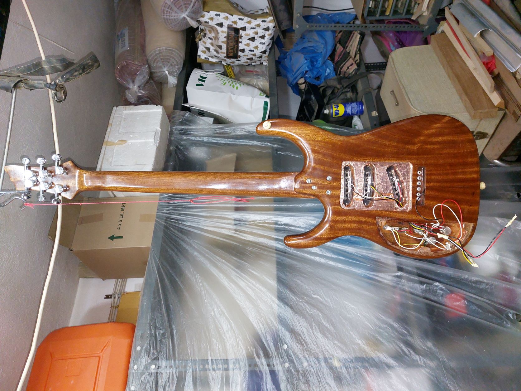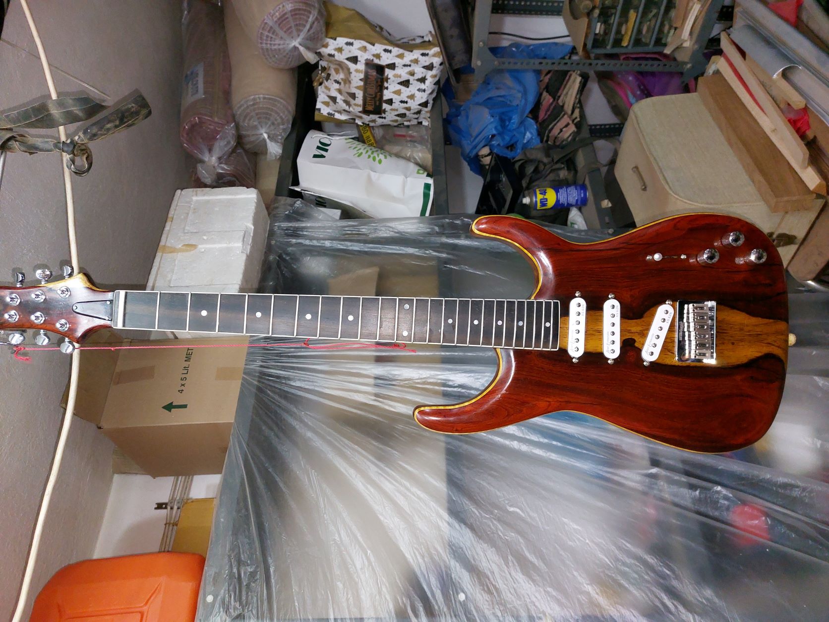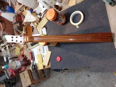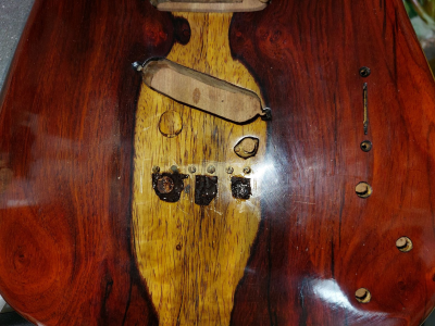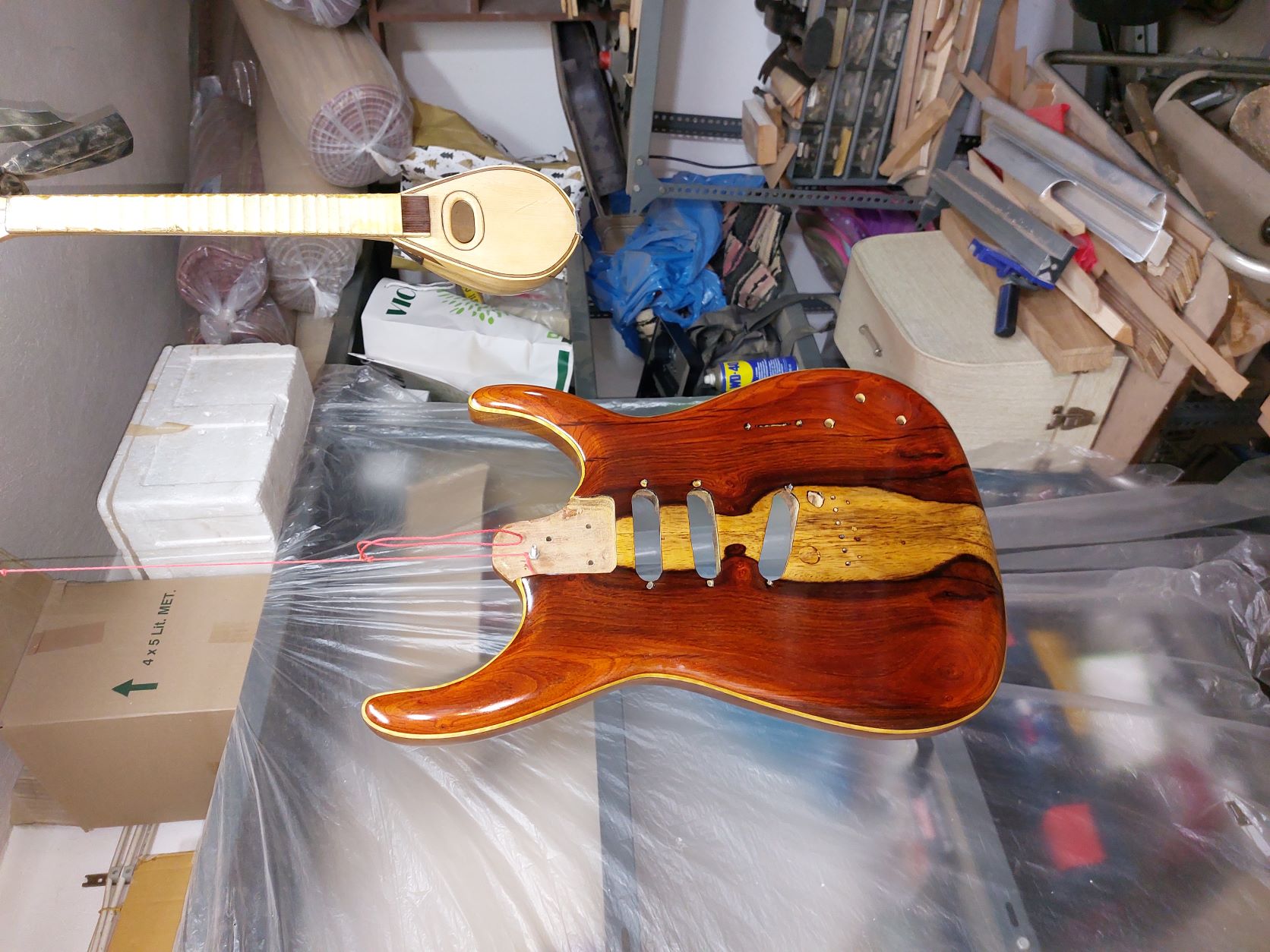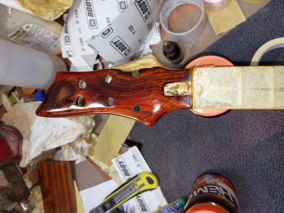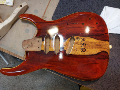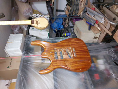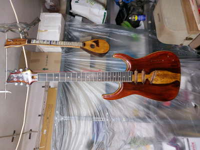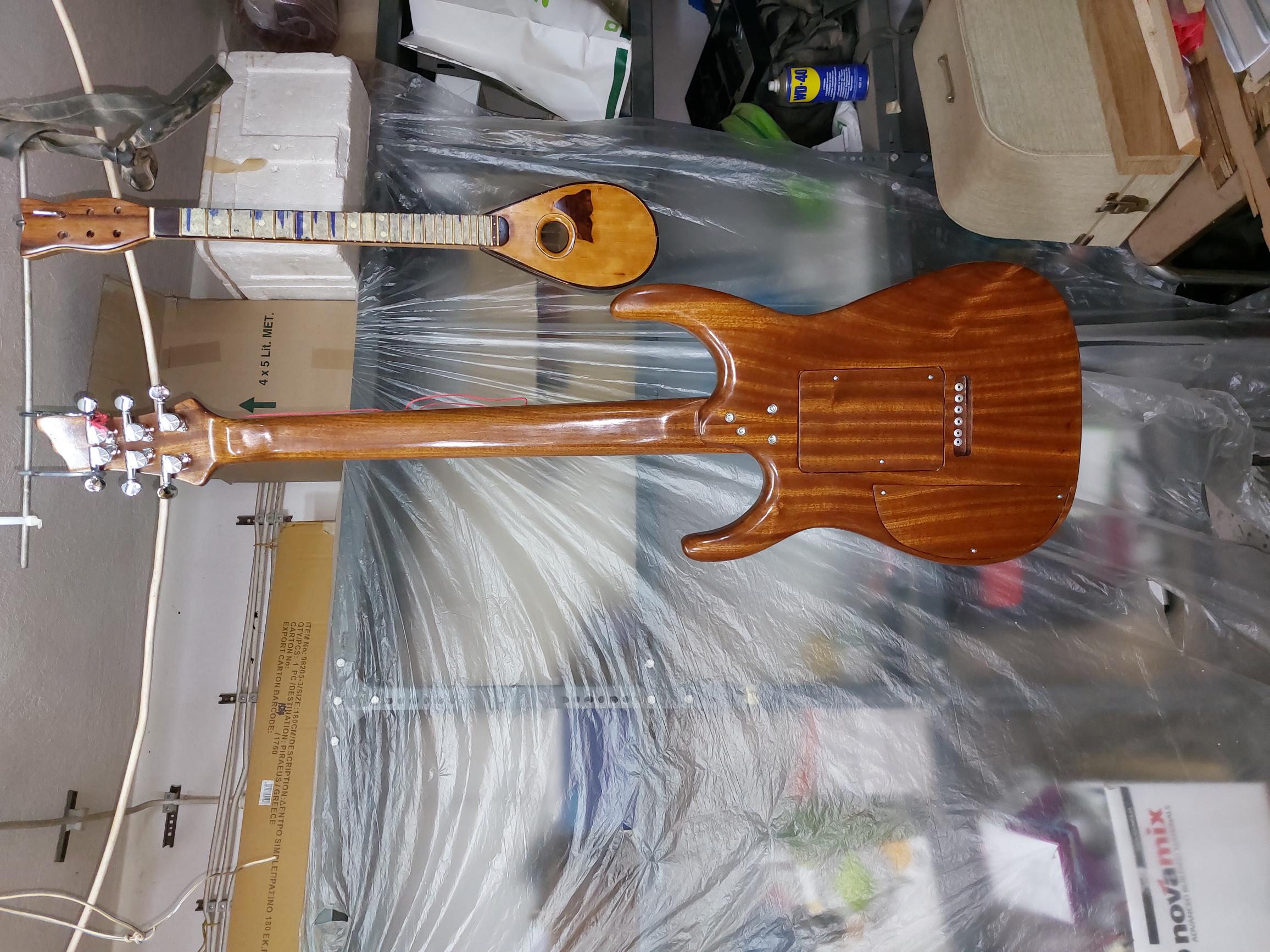 Θέλω να πω τον πόνο μου. Καθυστέρησα πολύ γιατί με έσκασε το κοκομπόλο. Όσο ΄πομορφο είναι τόσο με παίδεψε. Ομολογώ πως είδα πράματα που δεν τα περίμενα με τίποτα. Πέρασα την κιθάρα με βερνίκι αλκυδικό.  Το χαρακτηρηστικό του είναι πως αργεί να στεγνώσει, το έριξα και γω με τα βαριά κρύα και καθυστέρησε πολύ.  Η καθυστέρηση ήταν θέμα γιατί όσο δεν στέγνωνε και έμενε κρεμασμένο στο τσιγκέλι, η πολύ σκόνη που κυκλοφορέι στο εγαστήριο κόλλαγε πάνω στο βερνίκι. Την ίδια εποχή πέρναγα ταυτόχρονα  βερνίκι και στη resonator. Με δυσκόλεψε το βερνίκι αλλά τέλειωσε. Η ηλεκτρική αμ δε!!