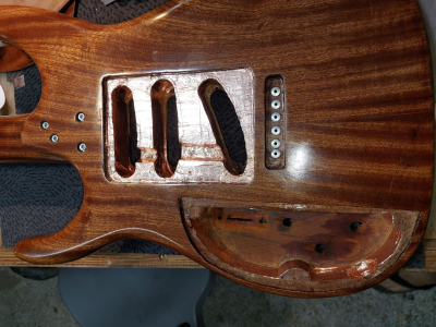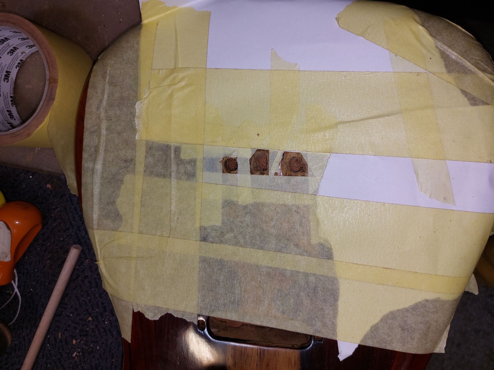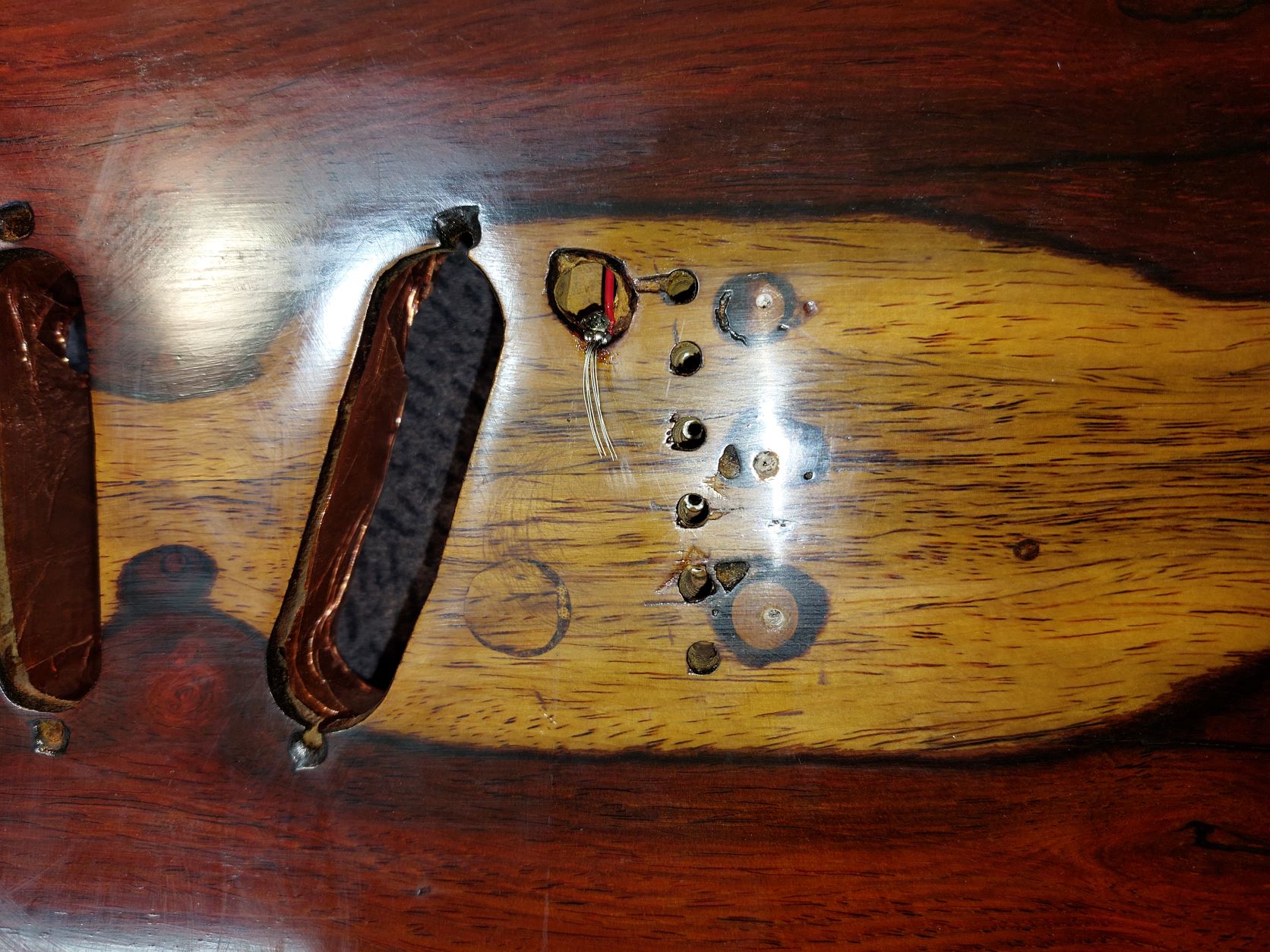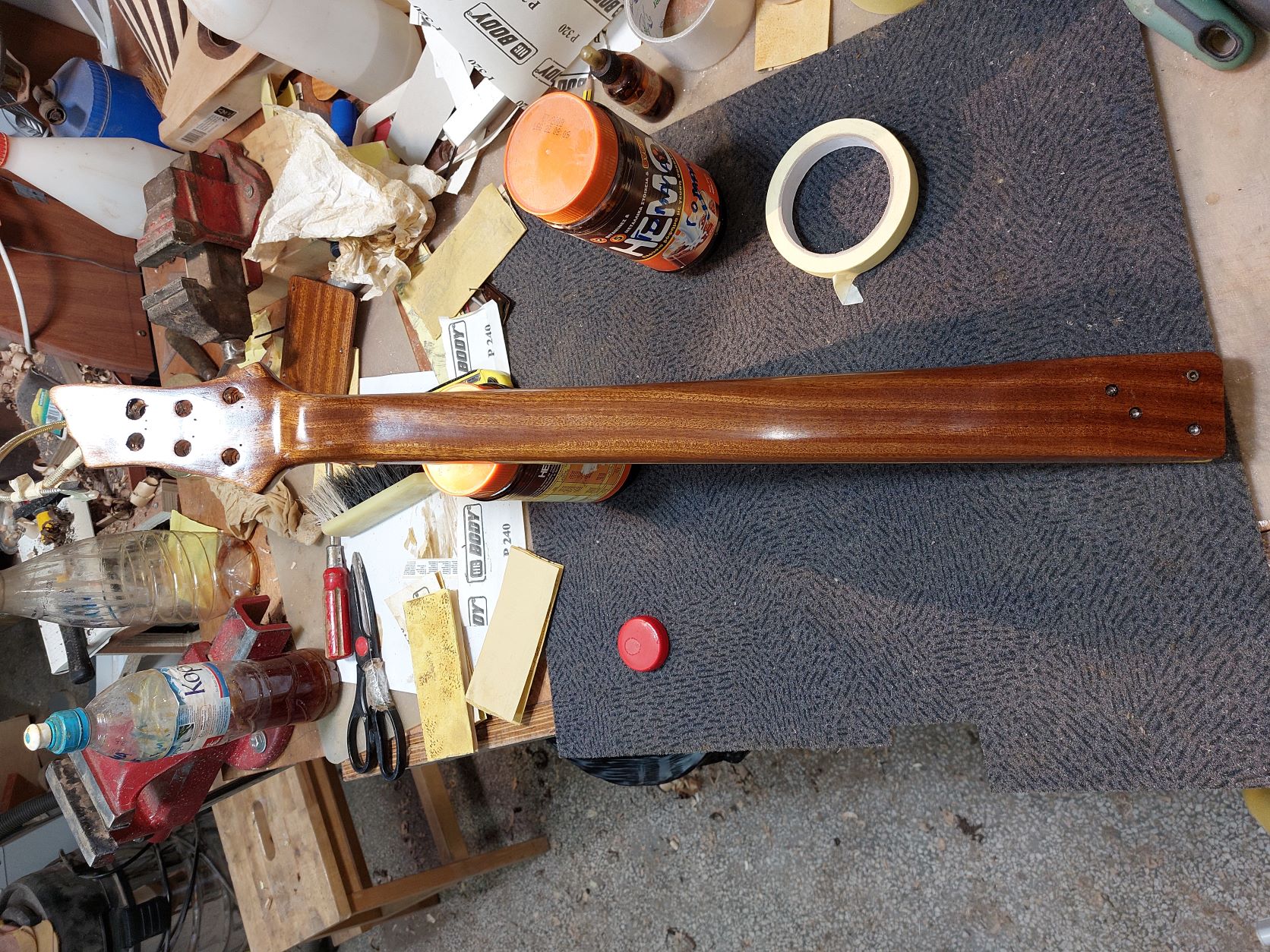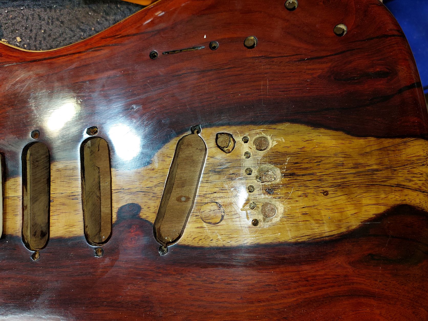 Σήμερα που τσεκάρισα στέγνωσαν οι κόλλες και γίνανε σίδερο. Θα ξυριστούν ότι εξέχει, θα τριφτεί το καπάκι ξανά και θα ξαναπεραστούν λούστρα μπας και καταφέρω να τελειώσω την έρμη την κιθάρα.