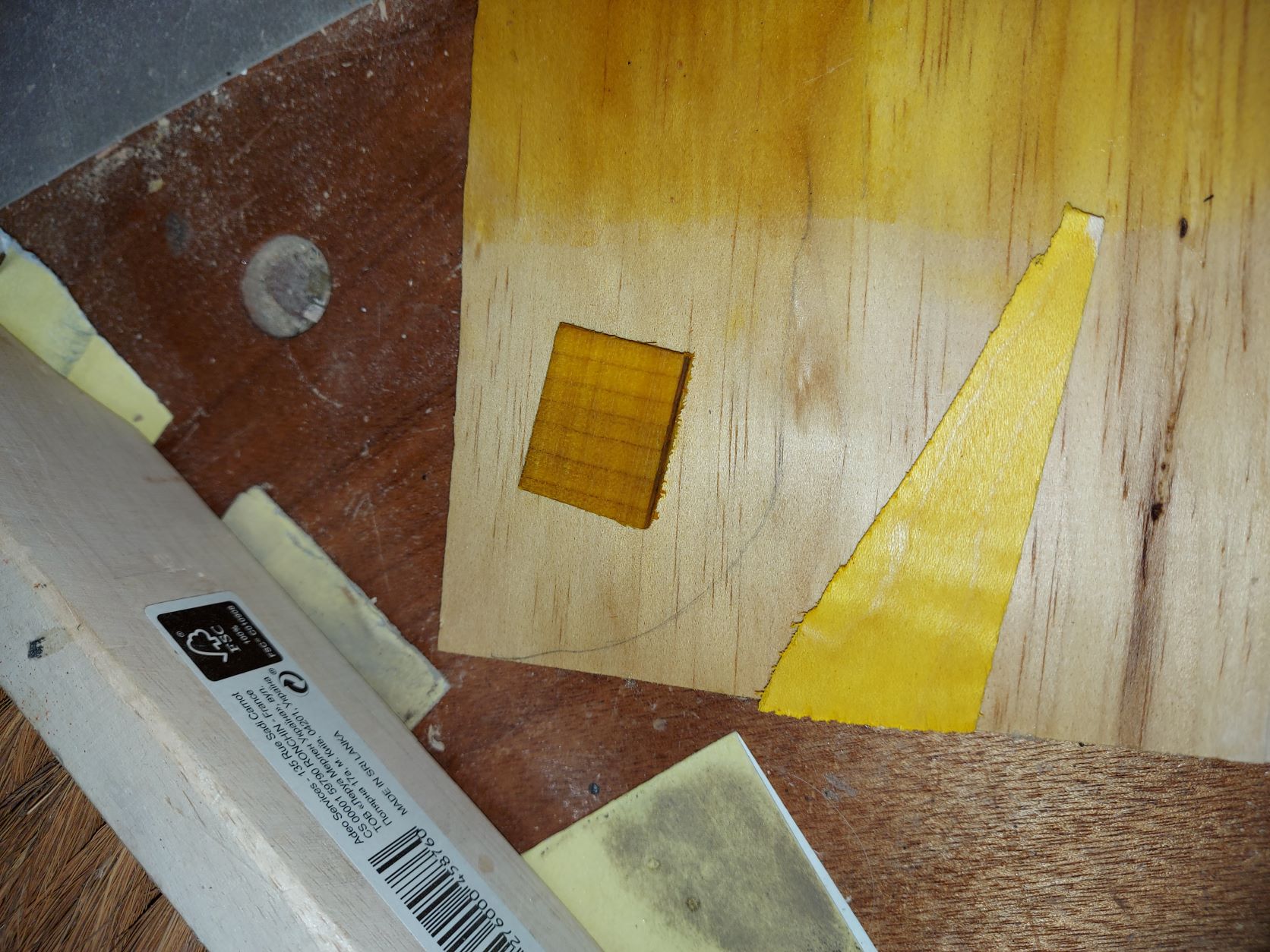 Το μίγμα που ετοιμάστηκε περάστηκε και με πανάκι αλλά και με πινέλο σε ξύλο που είχε τριφτεί μέχρι 400αρι γυαλόχαρτο. Όταν στέγνωσε το ξύλο πετάχτηκαν κάποιες ακίδες από το ξύλο. Με ελαφρύ γυαλοχαρτάρισμα πάλι με 400αρι η επιφάνεια έγινε πάλι λεία και περάστηκαν και τα επόμενα χέρια χρωστικής. Μετά το κόκκινο [πέρασα και ένα χέρι πορτοκαλί, ξανά κόκκινο και μετά αραιωμένη γομαλάκα. Περάστηκαν συνολικά 4-5 χέρια χρωστικής. Με το ρπώτο χέρι δεν έχεις ομοιόχρωμη επιφάνεια, σαν να αφήνει κηλίδες κάπως αλλά με τα επόμενα ομογενοποείται το χρώμα.