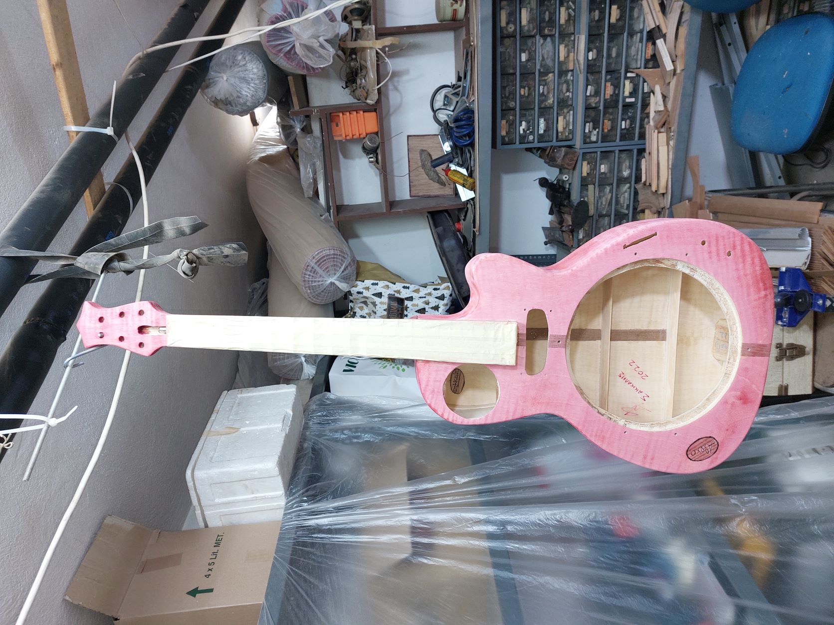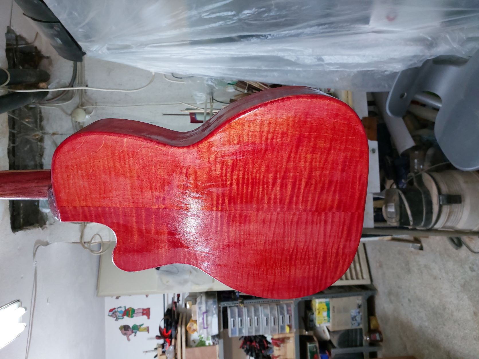 Η κιθάρα είναι κελεμπέκι και το μπράτσο καστανιά. Ομολογώ πως η καστανιά βγάζει μια κοκκινο-μωβίζουσα απόχρωση που μου άρεσε πολύ. Αν δεν περάσεις την πορτοκαλί χρωστική το κόκκινο αφήνει μωβ αποχρώσεις. Πιστεύω τελικά πως θα ήταν καλύτερο να περαστεί πρώτα το πορτοκαλί και μετά το κόκκινο. Τελικά και με το βερνίκι από πάνω δένει όμορφα. Θα μπορούσε το βερνίκι να είναι γομαλάκα, αλλά στη δική μου περίπτωση προτίμησα ένα πιο σκληρό βερνίκι.