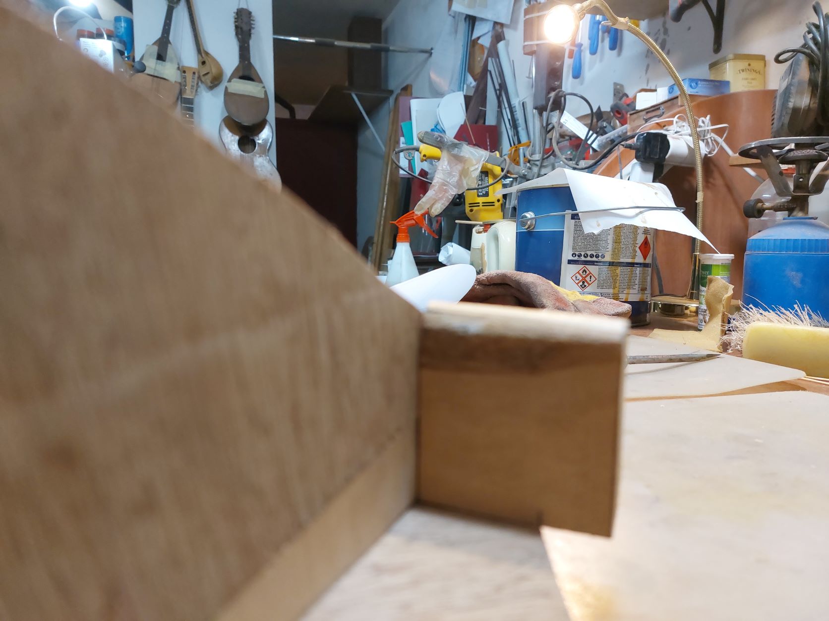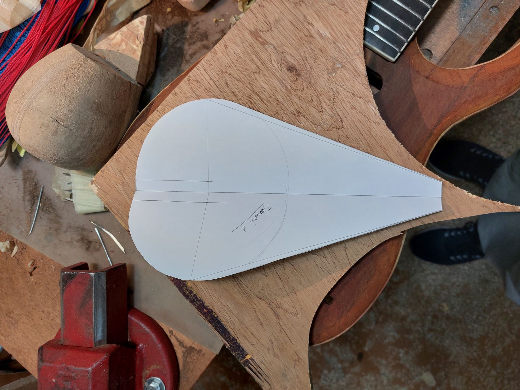 Τελειώντας καλούπι πρέπει να φτιάξουμε και τον τάκο. Ο τάκος φτιάχνεται συνήθως από φλαμούρι. Ο λόγος είναι πως θέλουμε ένα ξύλο ελαφρύ και όχι σκλήρό για να πάίρνει τις τάσεις. Τα νερά του τάκου τα πέρνουμε κάθετα στα νερά του μάνικου. Υπάρχει η λογική ο τάκος να μην είναι ενιαίος αλλά να αποτελείται από διαφορετικά κομμάτια ούτως ώστε αν προκύψει κάποιο σκίσιμο του ξύλου είτε από αστοχία είτε από χτύπημα, το σκίσιμο να μην προχωρήσει εύκολα σε όλο το μήκος - πλάτος του ξύλου. Πολλοί βάζουνε και ένα κόντρα πλακέ λεπτό ανάμεσα στα δύο ξύλα φλαμούρι, ενώ φίλος προτείνει ο τάκος να γίνεται από κόντρα πλακέ θαλάσσης. Σε μεγάλα σκάφη (μπουζούκια), συνήθως βάζω διαφορετικά κομμάτια φλαμούρι και συνήθως με ένα κόντρα πλακέ ανάμεσα. Κατα καιρούς έχω φτιάξει και τάκο από έλατο, αν και στον συγκεκριμένο τάκος έβαλα 2 κομμάτια φλαμούρι με ενδιάμεσα καστανιά.