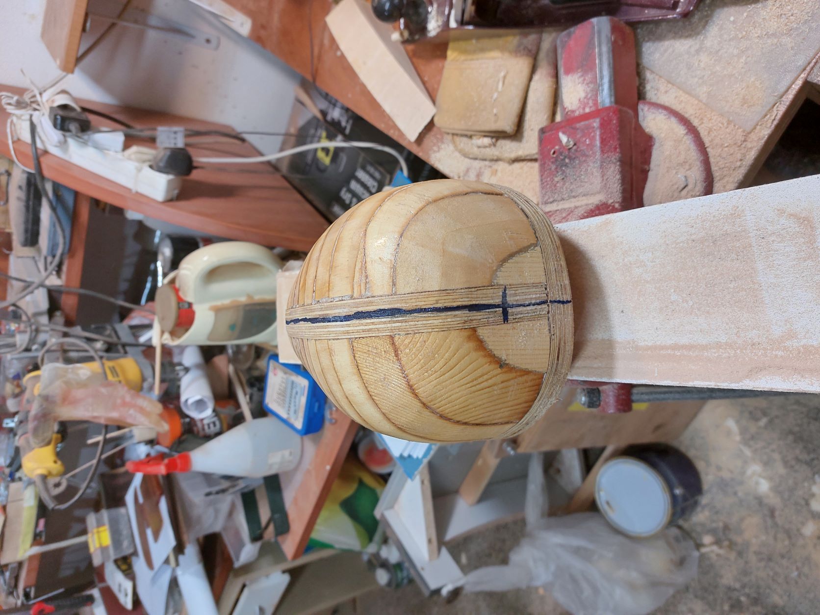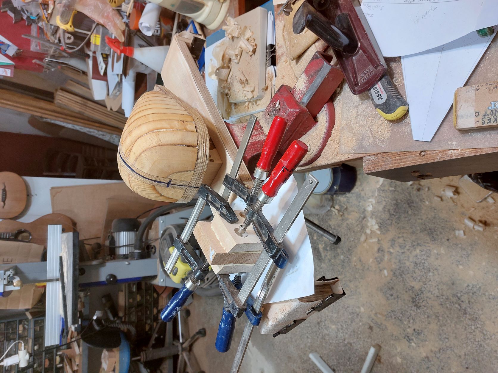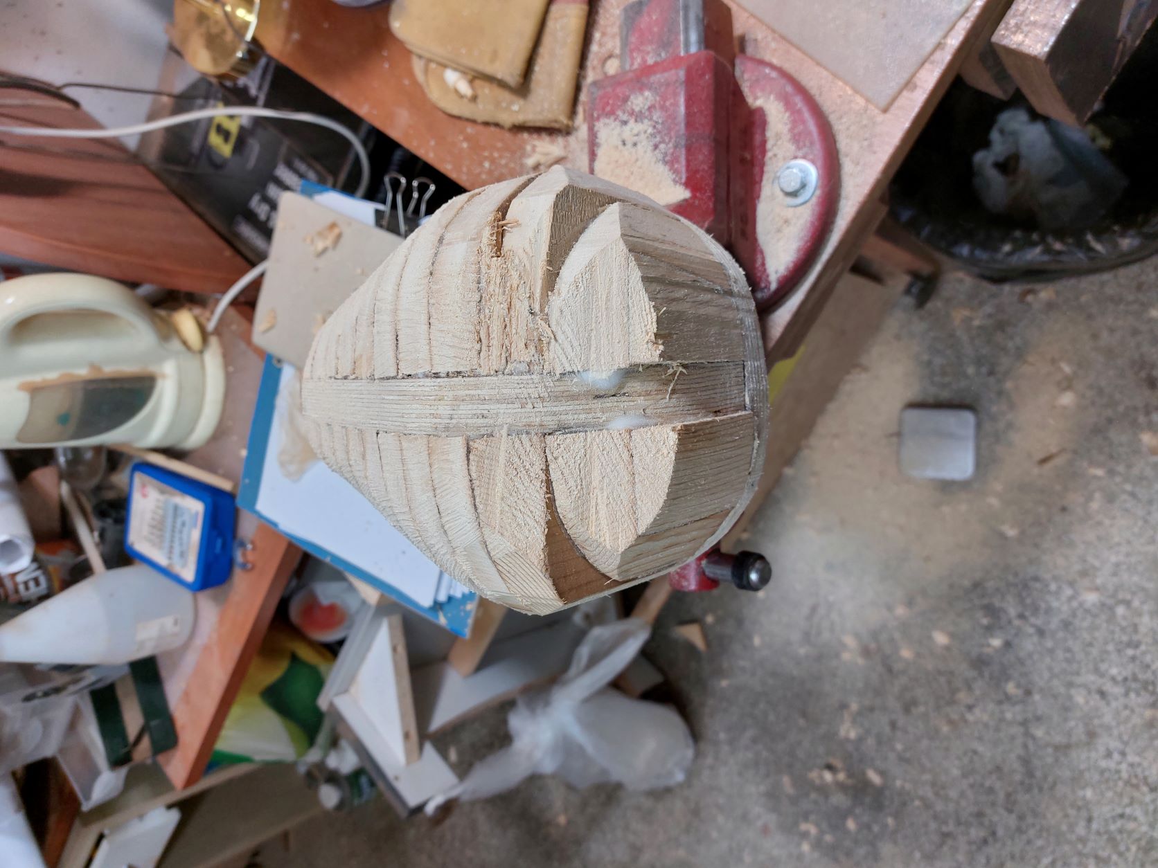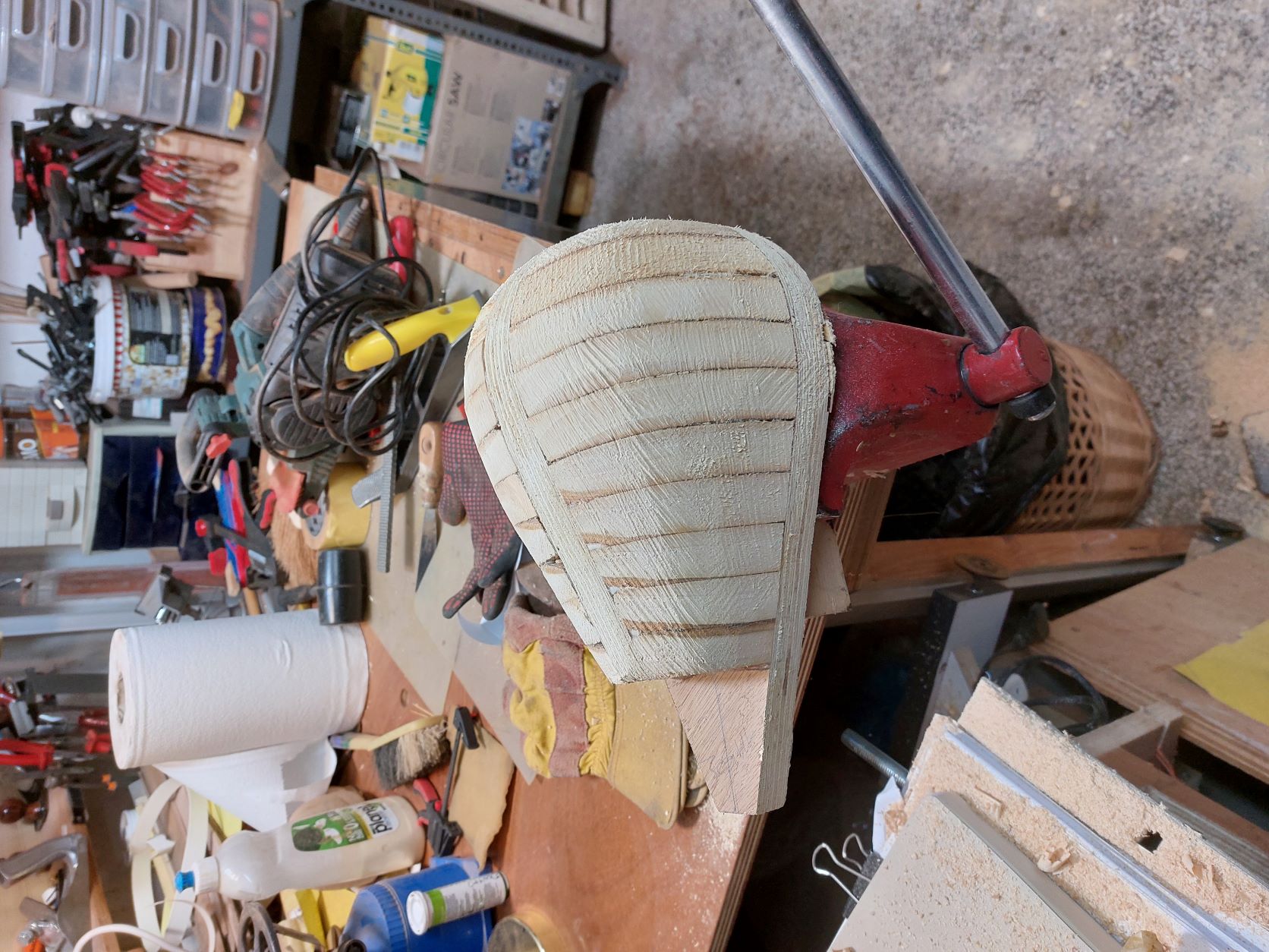 Αφού αφήσουμε τις κόλλες να στεγνώσουνε καλά το καλούπι θα πάρει την μορφή με τις πολλές γωνίες. Ένα ακόμα σημείο που πρέπει να αναφέρουμε είναι πως το καλούπι για να δουλεύται πρέπει να μπορεί να σταθεροποιηθεί σε μέγκενη. Για τον λόγο αυτόν από την κάτω μεριά του κόντρα πλακέ έχει βιδωθεί ένα ξύλο μακρόστενο και το καλούπι πλέον σταθεροποείται πλέον άνετα σε μέγκενη. Τώρα λοιπόν, με το πριόνι και με οδηγό τον εγκάρσιο νομέα, κόβουμε ότι περισσεύει από το πάνω μέρος. Αντίστοιχα ''ξυρίζουμε'' περιμετρικά του σκάφους ότι περισεύει και από εκεί. Για ναφέρουμε στην τελική του μορφή το καλούπι, πλέον θα δουλέψουμε με χοντρή ράσπα. Μια βασική αρχή που πρέπει να έχουμε πάντα υπόψη μας στην κατασκευή είναι ότι για να διατηρηθεί το σχήμα που αρχικά σχεδιάσαμε, θα πρέπει σε όλη την περίμετρο του τεταρτοκύκλιου το κάθε κομμάτι θα πρέπει να κρατηθεί ανέπαφη η περίμετρος στο σημείο που σχεδιάσαμε και το υπόλοιπο να σβήσει μέχρι την σχεδιασμένη περίμετρο του επόμενου κομματιού.΄Ποως φαίνεται στο σχέδιο αφαιρούμε την κόκκινη περιοχή. συγκεριμένα για τα κομμάτια Α και Β, το Β στο σημείο 3 δεν το κατεβάζουμε, αλλά στο υπόλοιπο μέρος φτάνουμε στο σημείο 2 όπου είναι η περίμετρος το κομματιού Α.