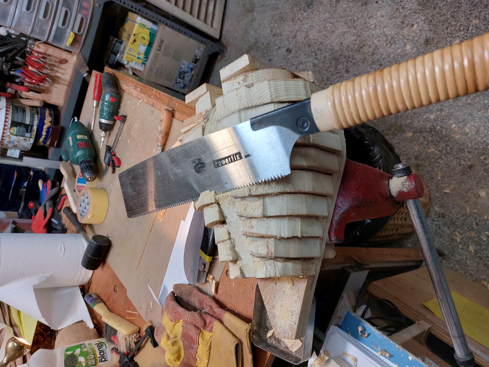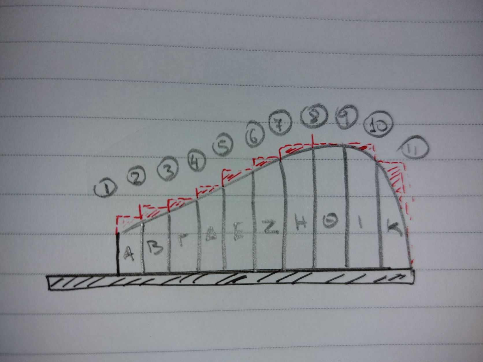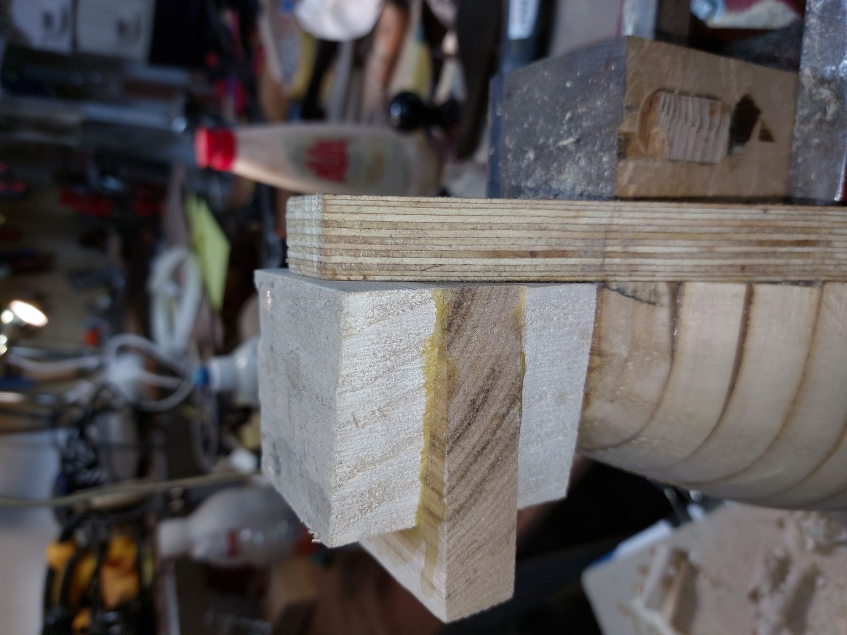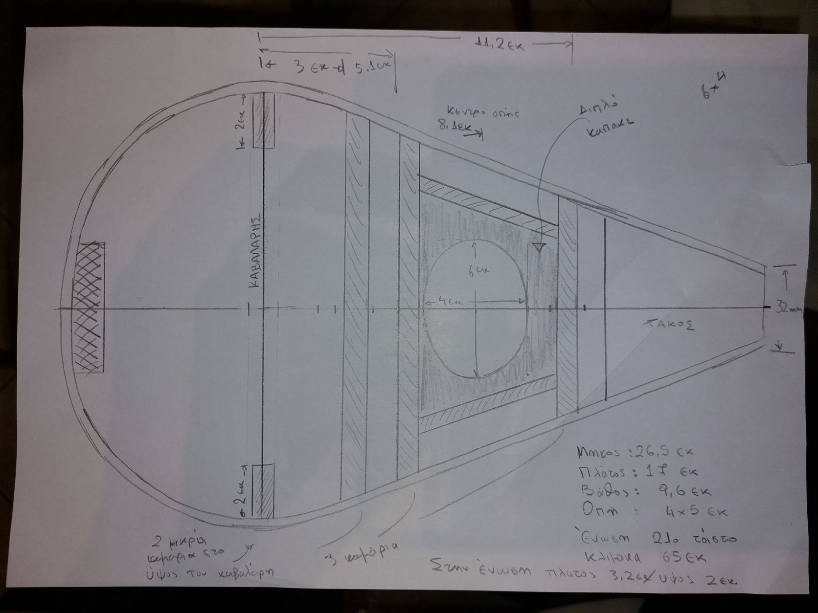 Αφού αφήσουμε τις κόλλες να στεγνώσουνε καλά το καλούπι θα πάρει την μορφή με τις πολλές γωνίες. Ένα ακόμα σημείο που πρέπει να αναφέρουμε είναι πως το καλούπι για να δουλεύται πρέπει να μπορεί να σταθεροποιηθεί σε μέγκενη. Για τον λόγο αυτόν από την κάτω μεριά του κόντρα πλακέ έχει βιδωθεί ένα ξύλο μακρόστενο και το καλούπι πλέον σταθεροποείται πλέον άνετα σε μέγκενη. Τώρα λοιπόν, με το πριόνι και με οδηγό τον εγκάρσιο νομέα, κόβουμε ότι περισσεύει από το πάνω μέρος. Αντίστοιχα ''ξυρίζουμε'' περιμετρικά του σκάφους ότι περισεύει και από εκεί. Για ναφέρουμε στην τελική του μορφή το καλούπι, πλέον θα δουλέψουμε με χοντρή ράσπα. Μια βασική αρχή που πρέπει να έχουμε πάντα υπόψη μας στην κατασκευή είναι ότι για να διατηρηθεί το σχήμα που αρχικά σχεδιάσαμε, θα πρέπει σε όλη την περίμετρο του τεταρτοκύκλιου το κάθε κομμάτι θα πρέπει να κρατηθεί ανέπαφη η περίμετρος στο σημείο που σχεδιάσαμε και το υπόλοιπο να σβήσει μέχρι την σχεδιασμένη περίμετρο του επόμενου κομματιού.΄Ποως φαίνεται στο σχέδιο αφαιρούμε την κόκκινη περιοχή. συγκεριμένα για τα κομμάτια Α και Β, το Β στο σημείο 3 δεν το κατεβάζουμε, αλλά στο υπόλοιπο μέρος φτάνουμε στο σημείο 2 όπου είναι η περίμετρος το κομματιού Α.