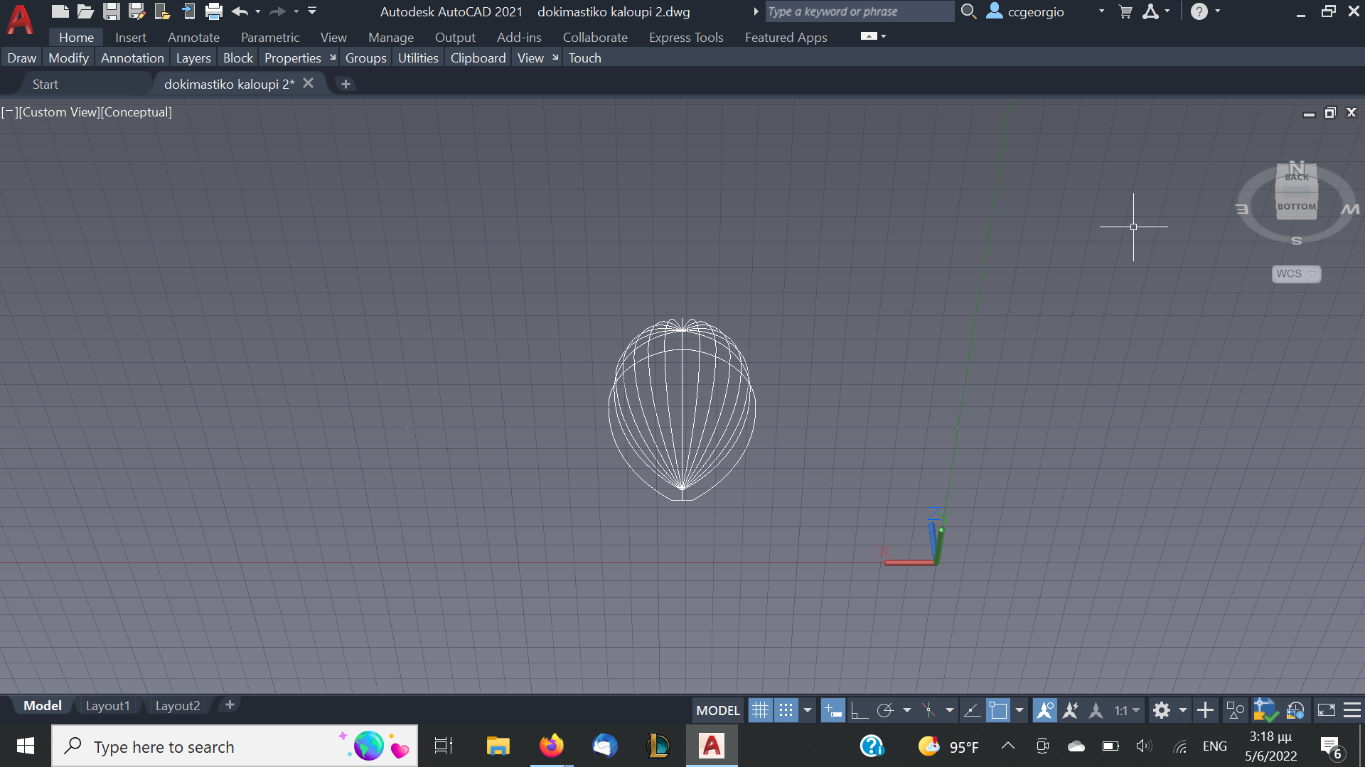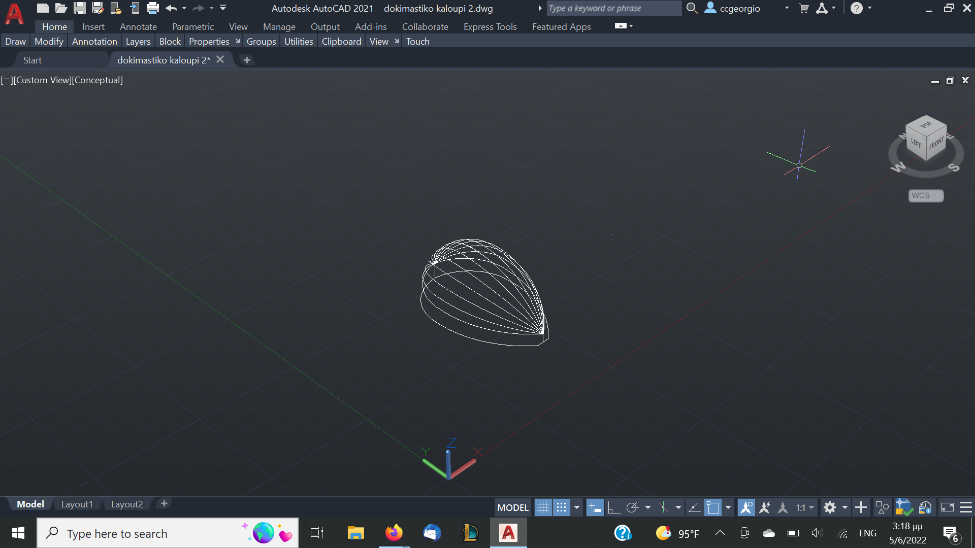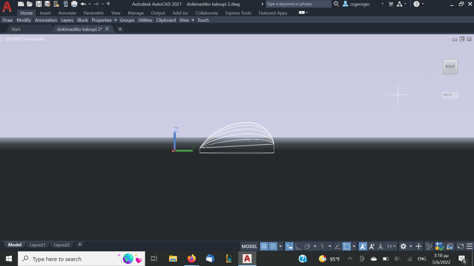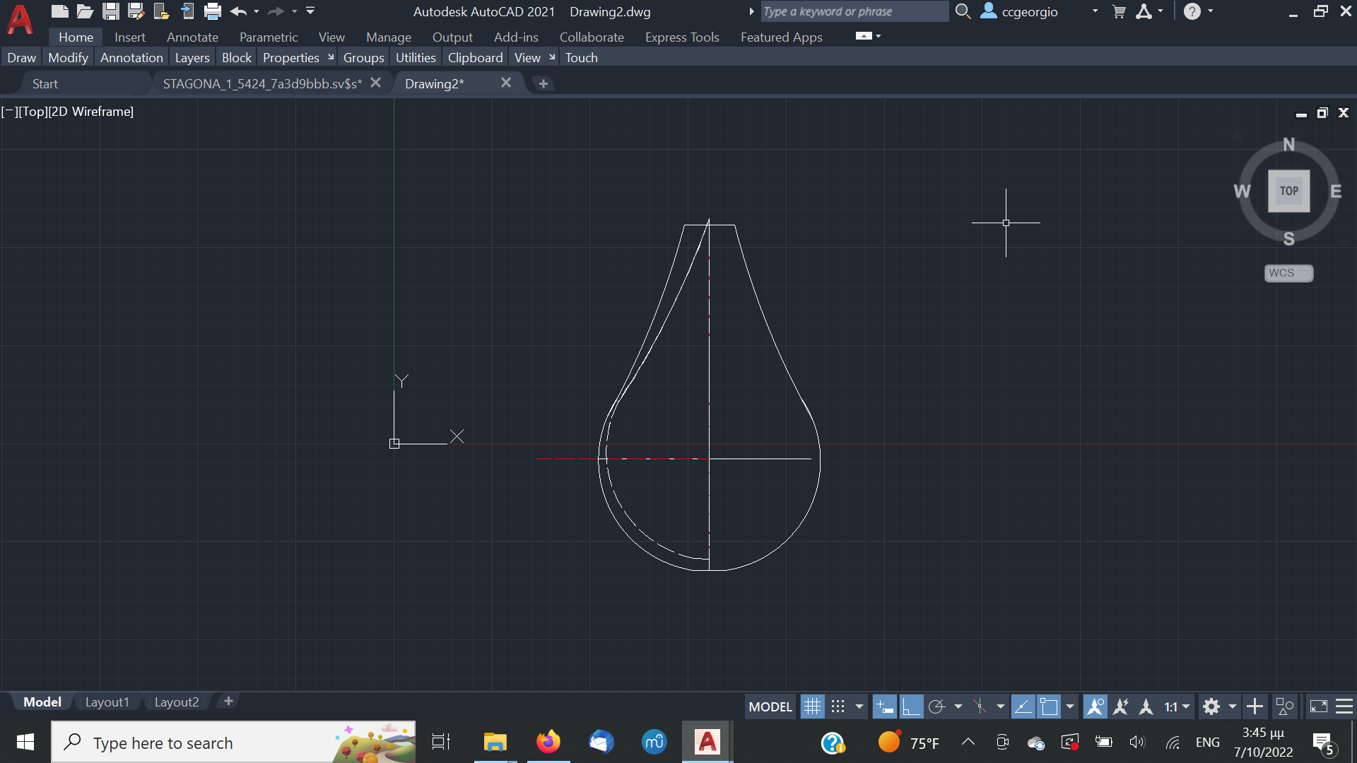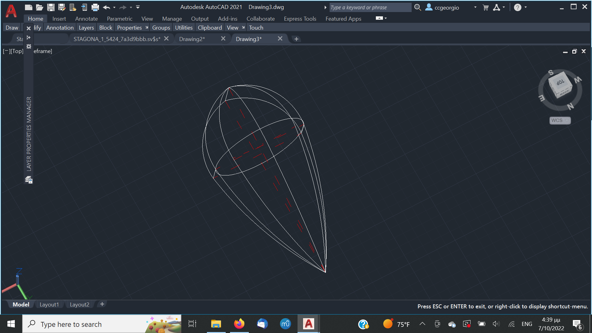 Αφού αφήσουμε τις κόλλες να στεγνώσουνε καλά το καλούπι θα πάρει την μορφή με τις πολλές γωνίες. Ένα ακόμα σημείο που πρέπει να αναφέρουμε είναι πως το καλούπι για να δουλεύται πρέπει να μπορεί να σταθεροποιηθεί σε μέγκενη. Για τον λόγο αυτόν από την κάτω μεριά του κόντρα πλακέ έχει βιδωθεί ένα ξύλο μακρόστενο και το καλούπι πλέον σταθεροποείται πλέον άνετα σε μέγκενη. Τώρα λοιπόν, με το πριόνι και με οδηγό τον εγκάρσιο νομέα, κόβουμε ότι περισσεύει από το πάνω μέρος. Αντίστοιχα ''ξυρίζουμε'' περιμετρικά του σκάφους ότι περισεύει και από εκεί. Για ναφέρουμε στην τελική του μορφή το καλούπι, πλέον θα δουλέψουμε με χοντρή ράσπα. Μια βασική αρχή που πρέπει να έχουμε πάντα υπόψη μας στην κατασκευή είναι ότι για να διατηρηθεί το σχήμα που αρχικά σχεδιάσαμε, θα πρέπει σε όλη την περίμετρο του τεταρτοκύκλιου το κάθε κομμάτι θα πρέπει να κρατηθεί ανέπαφη η περίμετρος στο σημείο που σχεδιάσαμε και το υπόλοιπο να σβήσει μέχρι την σχεδιασμένη περίμετρο του επόμενου κομματιού.΄Ποως φαίνεται στο σχέδιο αφαιρούμε την κόκκινη περιοχή. συγκεριμένα για τα κομμάτια Α και Β, το Β στο σημείο 3 δεν το κατεβάζουμε, αλλά στο υπόλοιπο μέρος φτάνουμε στο σημείο 2 όπου είναι η περίμετρος το κομματιού Α.