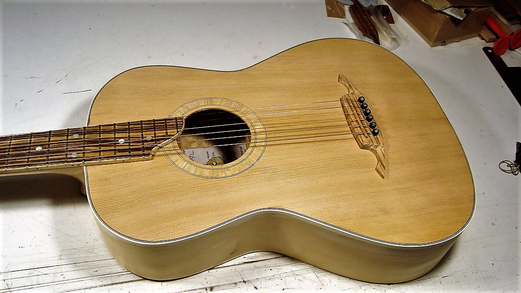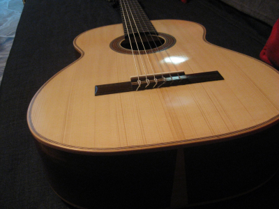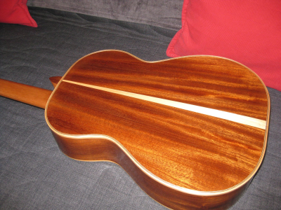 η οποία είχε γίνει με μοναδικές συνθήκες: το καπάκι ήταν το τελευταίο από μια παρτίδα σκούρου κέδρου που είχα βρει κάποτε στον Σοφιανό (δεν έχει πια) αλλά ήταν ήδη λεπτό από την αγορά του και τα έβαζα σε τζουράδες. Τέλος πάντων, είχα ένα μεγάλο κομμάτι και είπα να το δοκιμάσω σε μικρή κιθάρα και με "ελαφριές" χορδές. Με silver 11άρες χορδές όχι μόνο άντεξε, αλλά έβγαλε και πολύ καλό ήχο - τότε είχα σκεφτεί πως ο λεπτός κέδρος με silver ήταν καλός συνδυασμός και θα τον ξανάκανα... αμ δε ( για τον λεπτό κέδρο).
