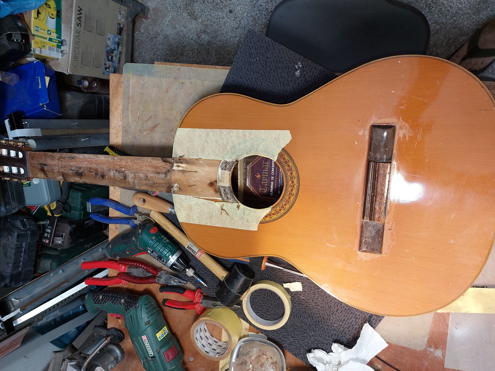 Κατά το Πάσχα ένας φίλος μου έφερε μια κλασσική κιθάρα για επισκευή. Καθώς έτρεχα τα πρότζεκτ για την έκθεση, του είπα πως θα την πιάσω μετά την έκθεση. Λίγα λόγια για το όργανο. Ισπανική κιθάρα taymar κατασκευής 1982. Προσωπικά μου φαινόταν φθηνοκατασκευή έλα όμως που το φιλαράκι την εκτίμησε διαφορετικά.