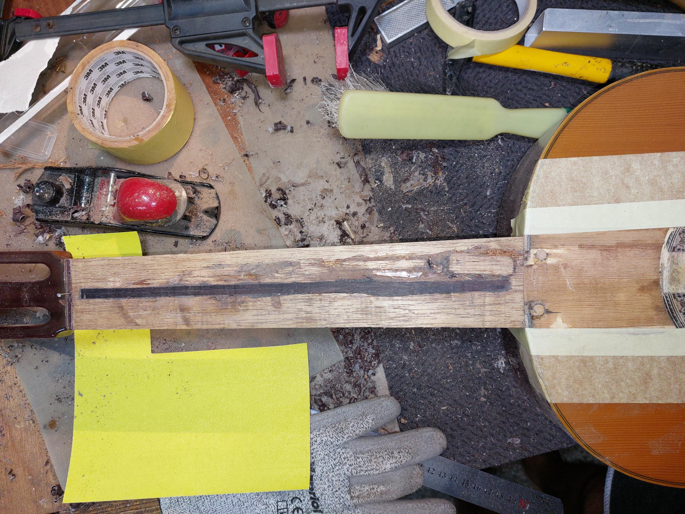 Και η επισκευή προχωράει. Αφού δεν έχω εμπιστοσύνη στο μαόνι του μπράτσου, ξεκόλλαγε κομμάτια μαζί με την ταστιέρα, προχώρησα να βάλω και μία κόντρα. Πήρα δυο φύλλα παλίσανδρο συνολικού πάχους 6.8 χιλιοστων. Έσκαψα ένα κανάλι βάθους περίπου 10 χιλιοστών για να εμφυτεύσω την κόντρα. Καθώς βαρέθηκα να φτιάξω οδηγούς το καναλι βγήκε φαρδύτερο σε μερικά σημεία, οπότε η χρήση εποξικής κόλλας ήταν μονόδρομος για να γεμίσουν τα τυχόν κενά. Και οι δυο κόντρες κολλήθηκαν μεταξύ τους επίσης με εποξική. Η κόλλα χρησιμοποιήθηκε και σαν στόκος σε κάποια βαθουλώματα που έγιναν και σε άλλα σημεία εκτός καναλιού στο μαόνι, για επιπεδοποιηθεί τελείως και να κολληθει σωστά η ταστιέρα.