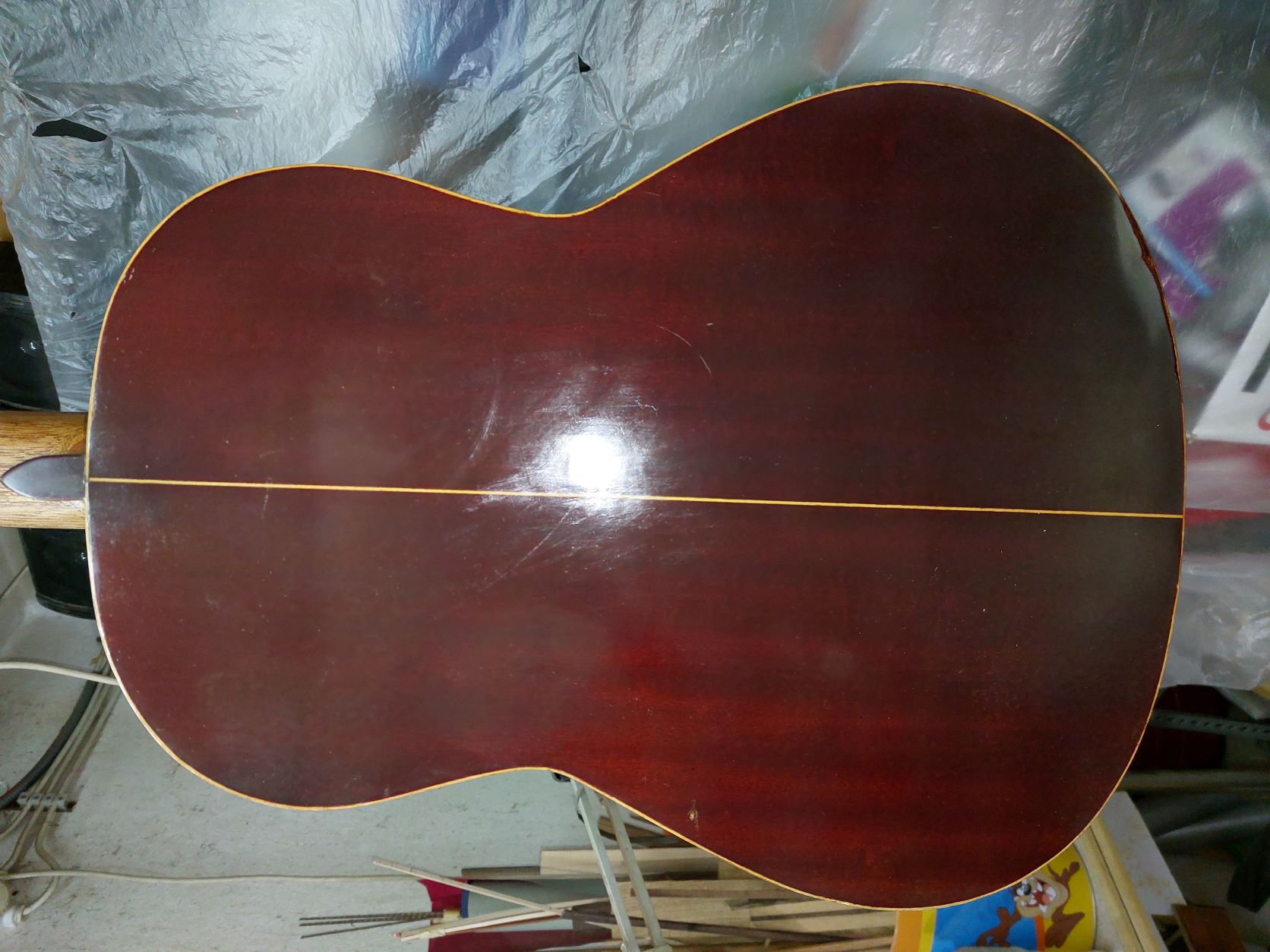 Μια αβαρία στην πλάτη για να επιδιορθωθεί έπρεπε κανονικά να φύγει όλο το βερνίκι πράγμα που δεν γινότανε. Τρίφτηκε τοπικά, βάφτηκε με μαρκαδόρο αποκατάστασης χρώματος και βερνικώθηκε. Φαίνεται βέβαια αλλά σίγουρα καλύτερα από πριν.