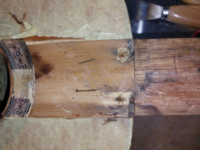 Ξηλώνοντας την ταστιέρα, επιβεβαιώθηκε η αρχική μου εντύπωση πως πρόκειται για φθηνοκατασκευή. Εκτός από το μαλακό μαόνι, ανακάλυψα πως και το καπάκι δεν είναι μασίφ. Έχει ένα λεπτό φύλλο καπακιού, λογικά κέδρος (πάνω σε κόντρα πλακέ; ή σε άλλο ξύλο). Προς το παρόν δεν το έψαξα. Αυτό όμως που με τρέλανε είναι πως βρήκα δύο μικρά καρφιά σκουριασμένα πέρα ως πέρα. Παρόλο που δεν νομίζω πως εξυπηρετούσαν κάτι, τα αντικατέστησα με μικρές καβίλιες.