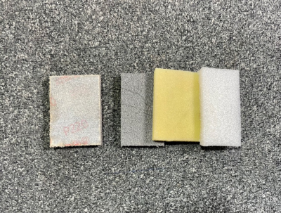 Κάποιες φορές κολλάω το γυαλόχαρτο με κόλλα χειροτεχνίας κατευθείαν στους μαλακούς τάκους από αφρώδη/ελαστικά υλικά συσκευασίας. Ο αριστερός τάκος της φωτογραφίας παρακάτω για παράδειγμα έχει κολλημένο ένα Ρ220.